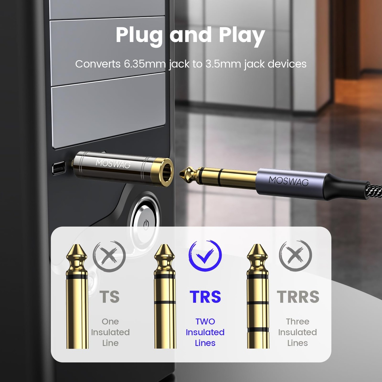 MOSWAG 6.35mm 3.5mm 変換(3極) 6.35 3.5 ステレオミニプラグ 6.35mm to 3.5mm(メス to オス) ステレオ標準プラグ交換アダプタ、アンプ、調音台、ホームシアター機器、エレキギターに適している