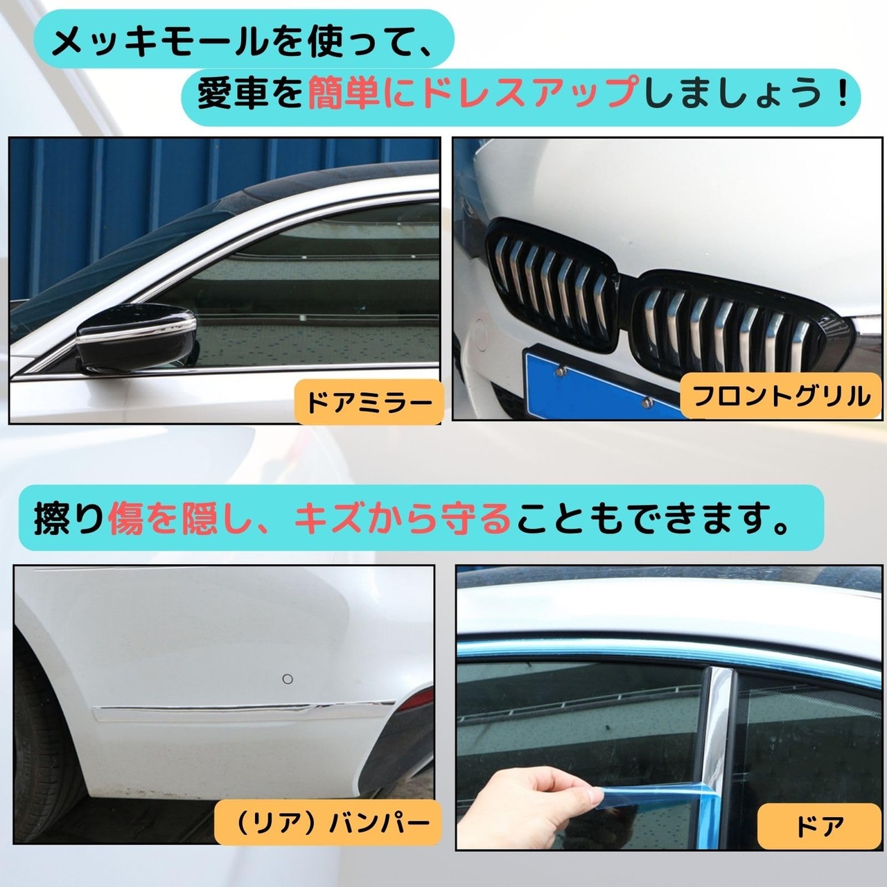 【メッキモールの役割】メッキモール(メッキテープ/マルチモール)は、車の外観をスタイリッシュにするアクセサリーです。主な役割:車のドレスアップ、車の傷防止、既存の傷隠し、耐久性が高く、物理的なダメージから車を守るが挙げられます。