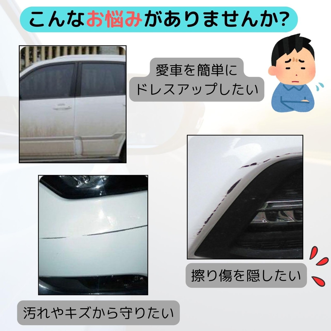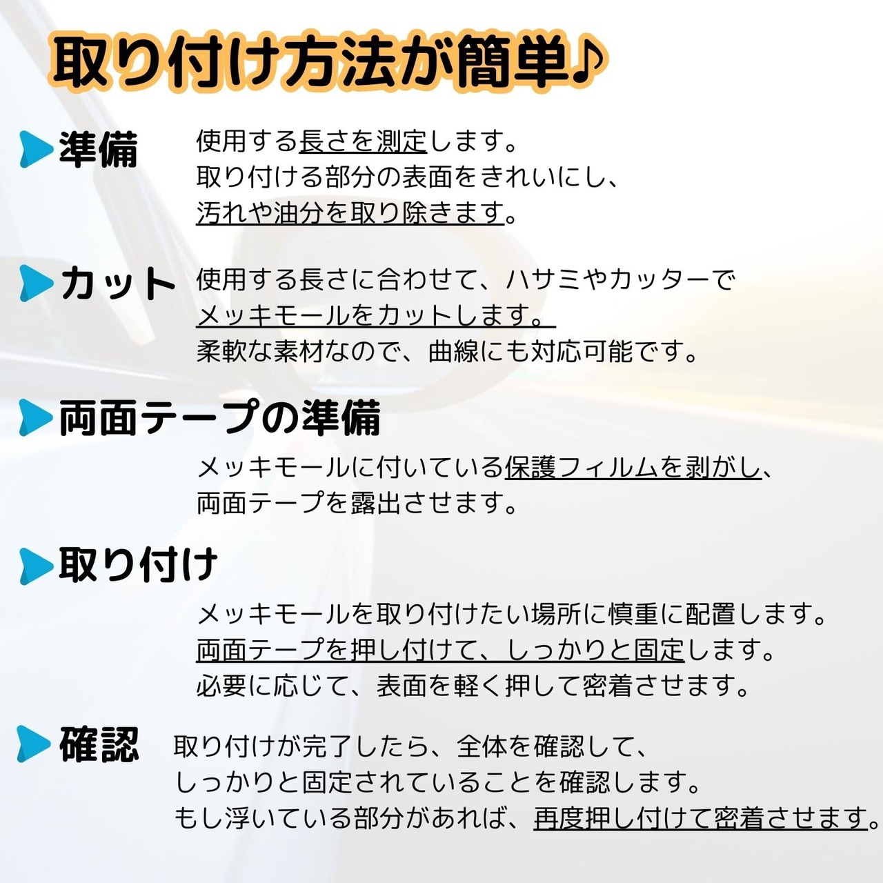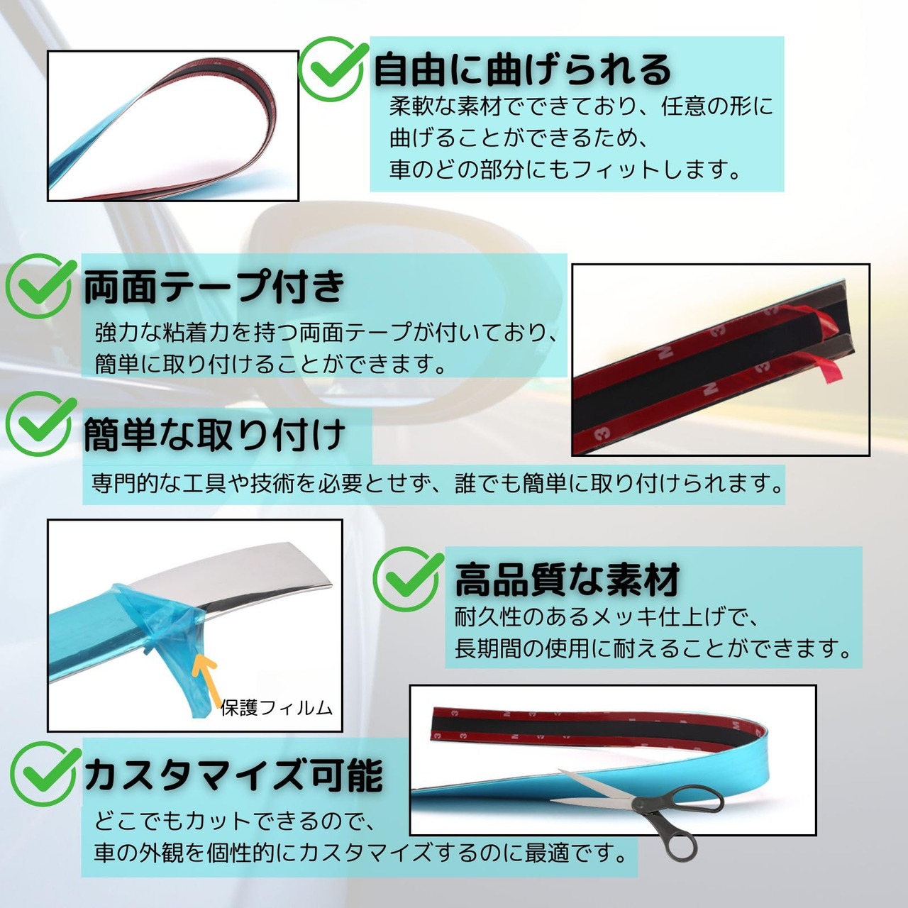 【取り付けが簡単】取り付けは非常に簡単です。強力な両面テープが付属しているため、初心者の方でも簡単に取り付けが可能です。柔軟性のある素材なので、コーナーやカーブ部分にもフィットし、誰でも簡単に愛車を美しく仕上げることができます。