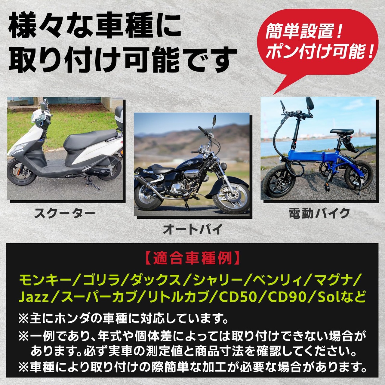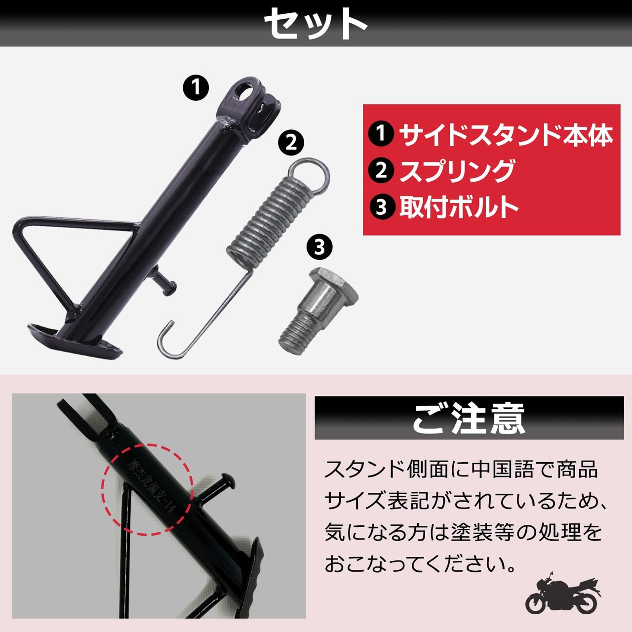 【セット内容】ショートサイドスタンド本体×1・取付ボルト×1・リターンスプリング×1 【適合車種例】モンキー、ゴリラ、ダックス、シャリー、ベンリィ、マグナ、Jazz、スーパーカブ、リトルカブ、CD50、CD90、Jazz、マグナ、Solなど※一例であり、年式や個体差によっては取り付けできない場合があります。必ず実車の測定値と商品寸法を確認してください。