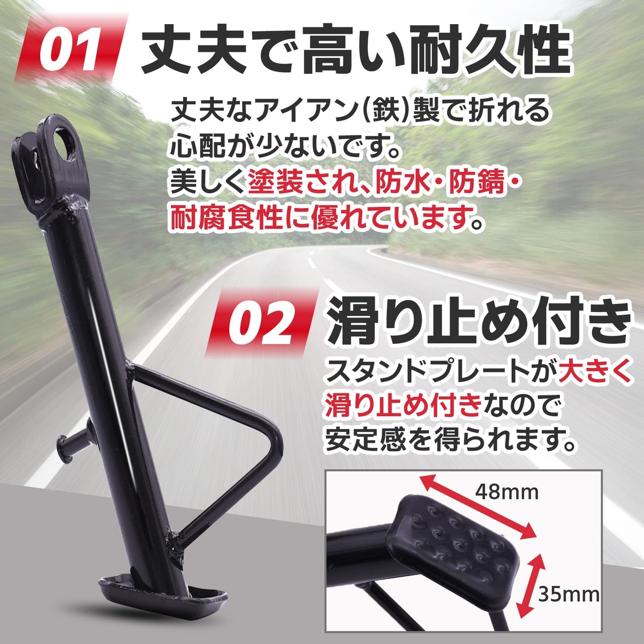 安定性向上: 純正スタンドと比べ、停車時の角度が大きくなり、強風や荷物の積み下ろし時でも安心してご使用いただけます。特に坂道や段差の多い場所での駐車に最適です。