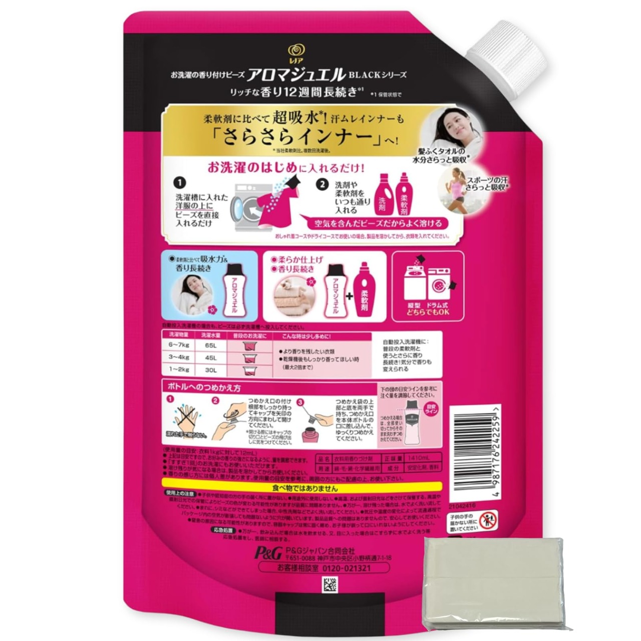 バスタオルを6回使っても、この製品は柔軟剤と比べて優れた吸水力と長続きする香りをキープします。<br>髪ふくタオルの水分をさっと吸収し、スポーツの汗も効果的に吸い取ります。<br>豊かな香りは最大で12週間1持続します。<br>柔軟剤に比べて吸水力と香りの持続力に優れ、縦型洗濯機やドラム式洗濯機の両方に対応します。<br>衣類を柔らかく仕上げます。<br>洗濯のはじめに入れるだけでOK!通常のアロマジュエルサイズ(420mL)よりも約3.3倍効果的です。<br>レノア ハピネス アロマジュエル、衣類の香りを一層引き立てます。