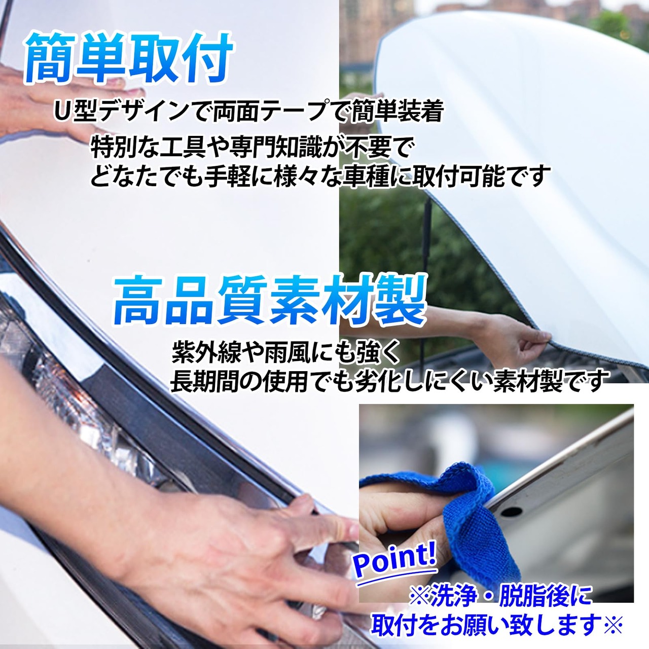 【簡単装着】U型デザインで、両面テープで簡単装着が可能です(洗浄、脱脂後に取付をお願い致します)どの車種にも簡単に取り付け可能です。特別な工具や専門知識が不要で、誰でも手軽に取り付けられるため、時間と手間を大幅に節約できます。