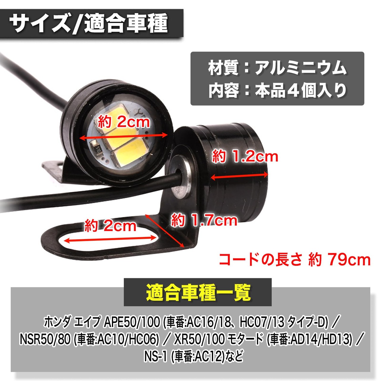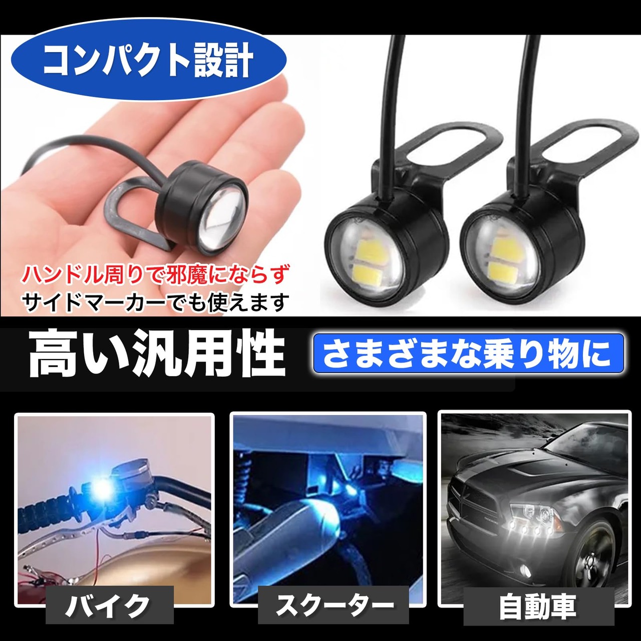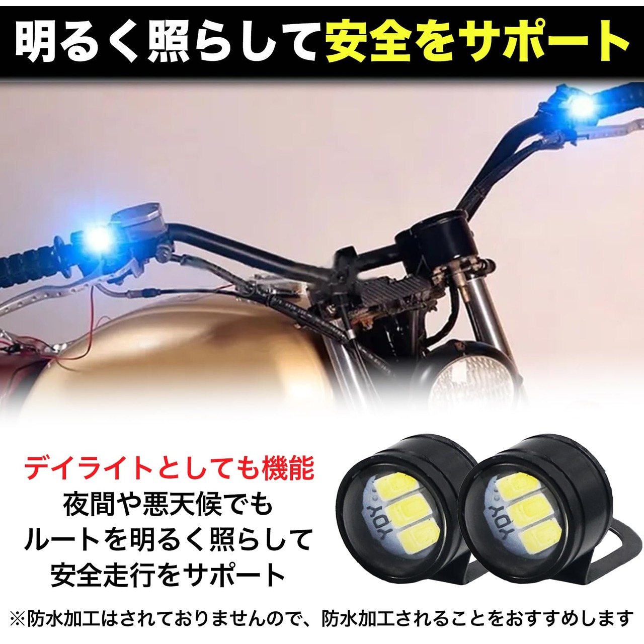 このストロボライトは、自転車やバイク、オートバイ、スクーター、自動車などさまざまな乗り物に利用可能な汎用パーツです。 夜間や悪天候時にも、デイライトとしての機能が活躍し、存在をアピールできます。 コンパクトサイズのフラッシュランプで、さまざまな場所に取り付け可能です。アイデア次第で、サイクリングやキャンプ、アウトドアなどにも活躍できます。 配線はプラスとマイナスを繋ぐだけの簡単取り付けです。 ホワイトとアイスブルーの2色を展開。点灯パターンは常時点灯と点滅点灯の3パターン。 公道で使用される場合、発光色や発光パターンによっては道路交通法違反になる場合があります。十分にご注意ください。