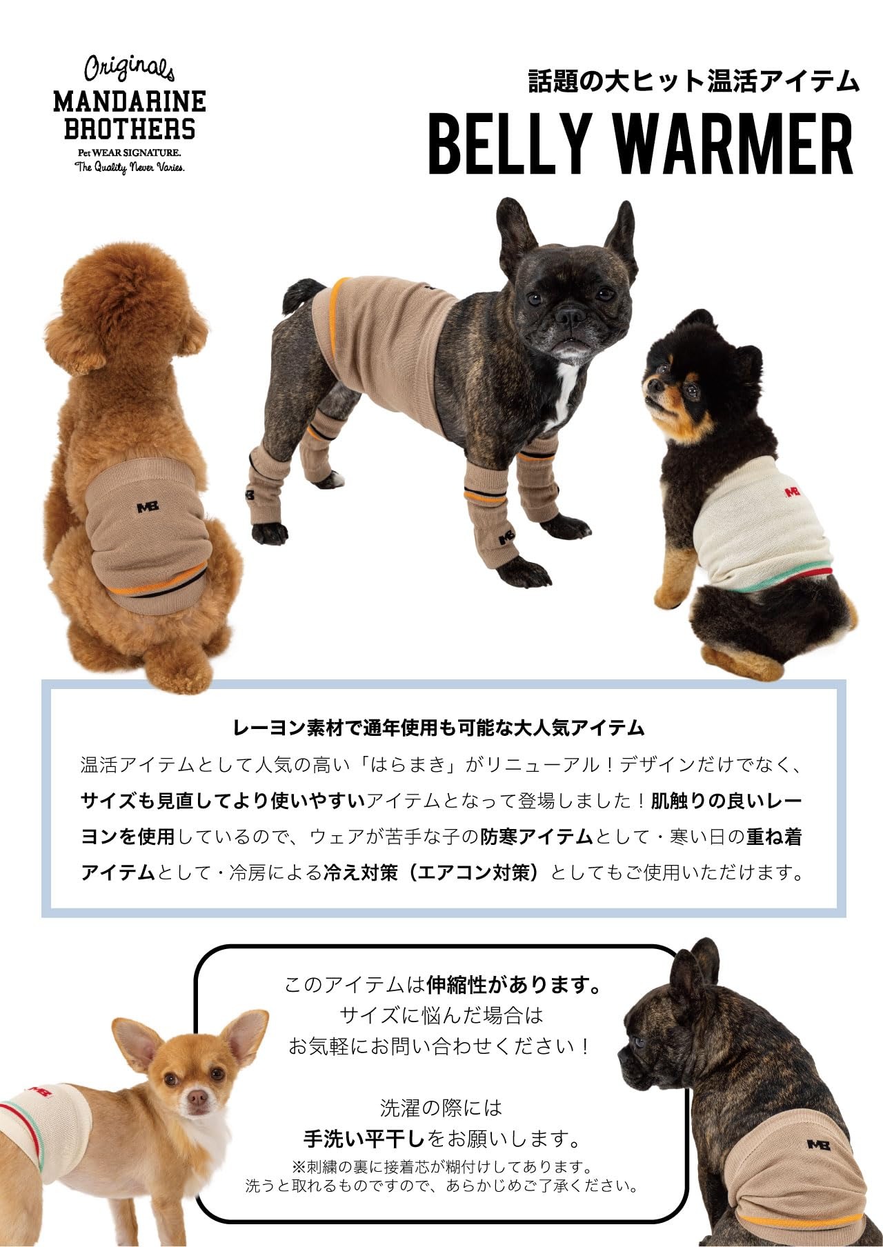「冷えは万病のもと」お腹を温めることで温活にも。これ一枚でお洋服が苦手なわんちゃんも安心。レッグウォーマーとコーディネートすれば、ひときわオシャレに変身! ・防寒対策として ・温活として ・エアコン対策にも ・ウェアが苦手な子にも ・MANDARINE BROTHERSの「MB」ロゴ入り ・2重ラインのアクセント 素材:Rayon 100%