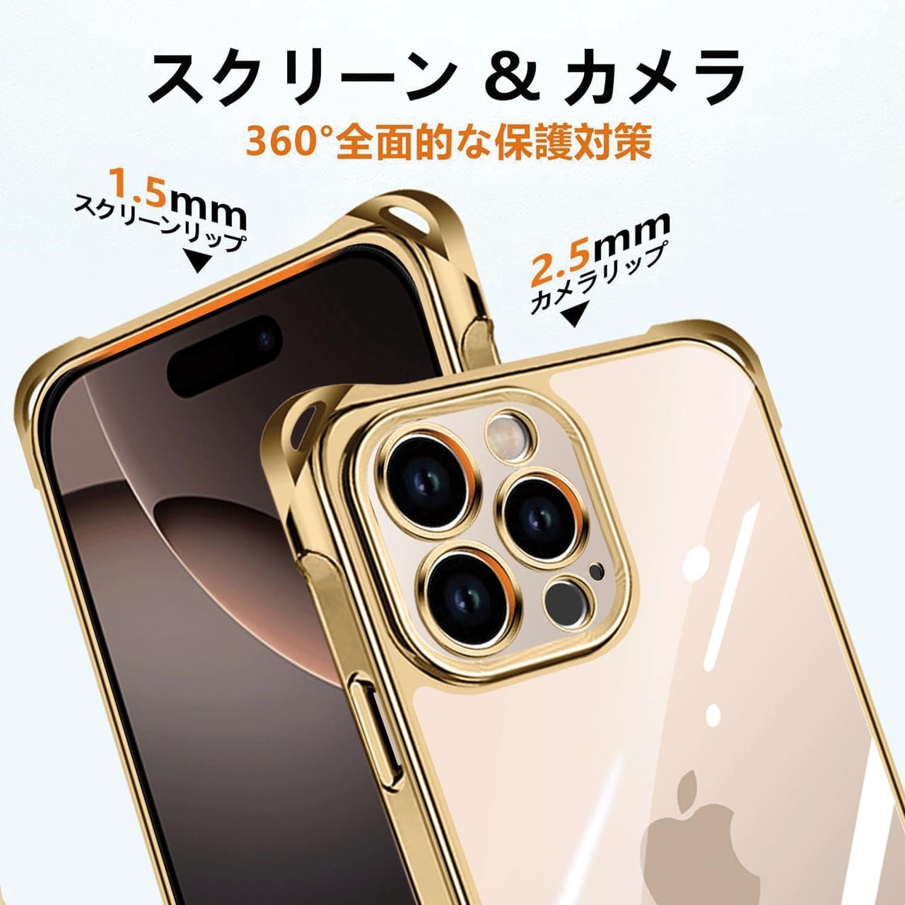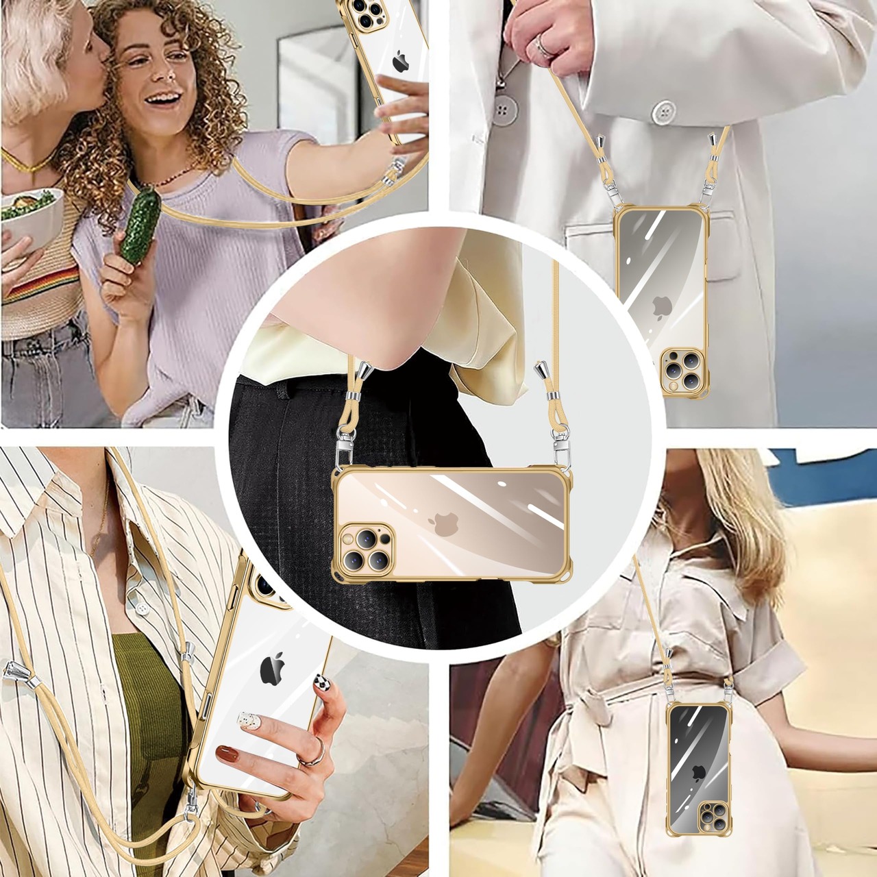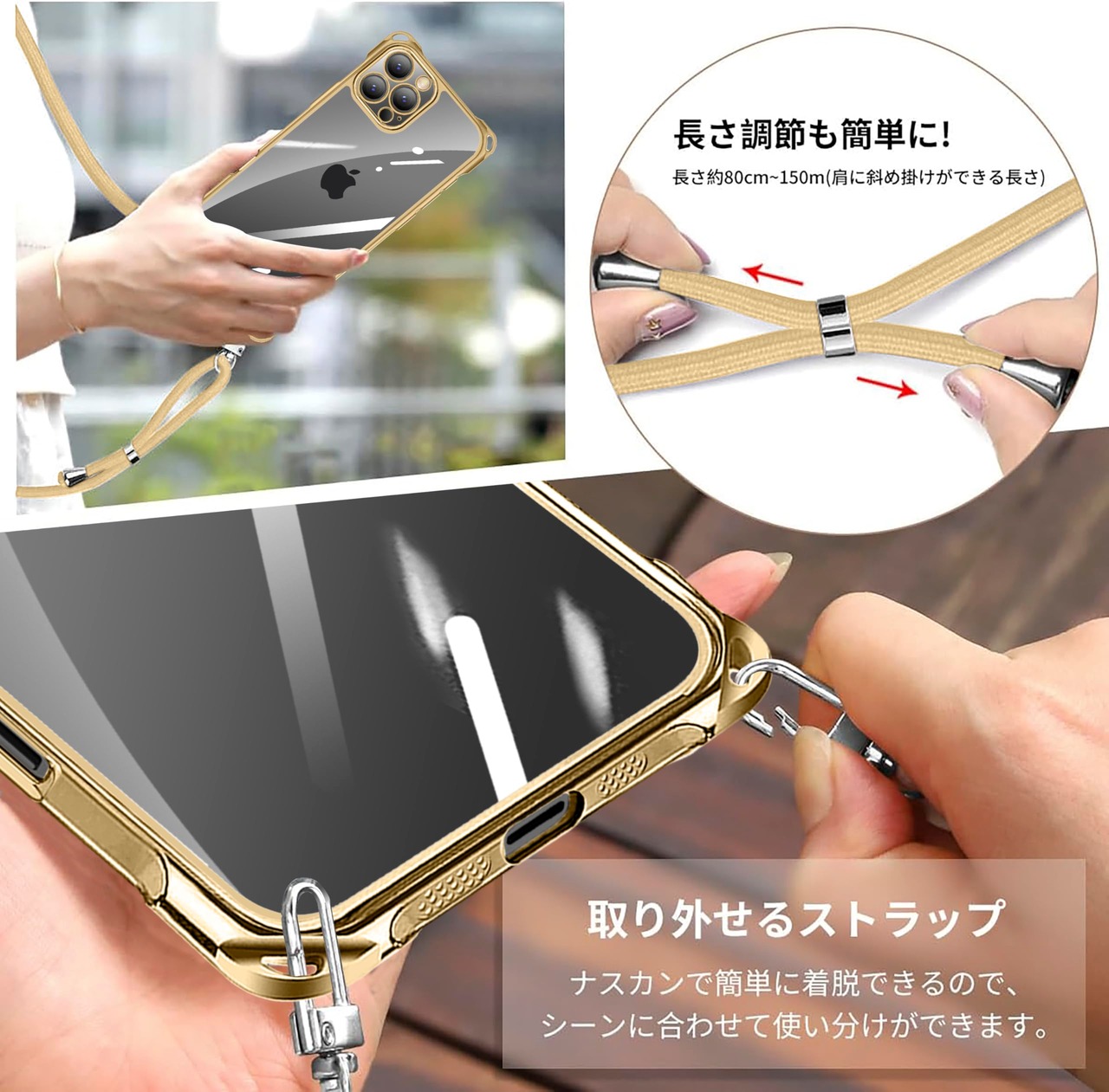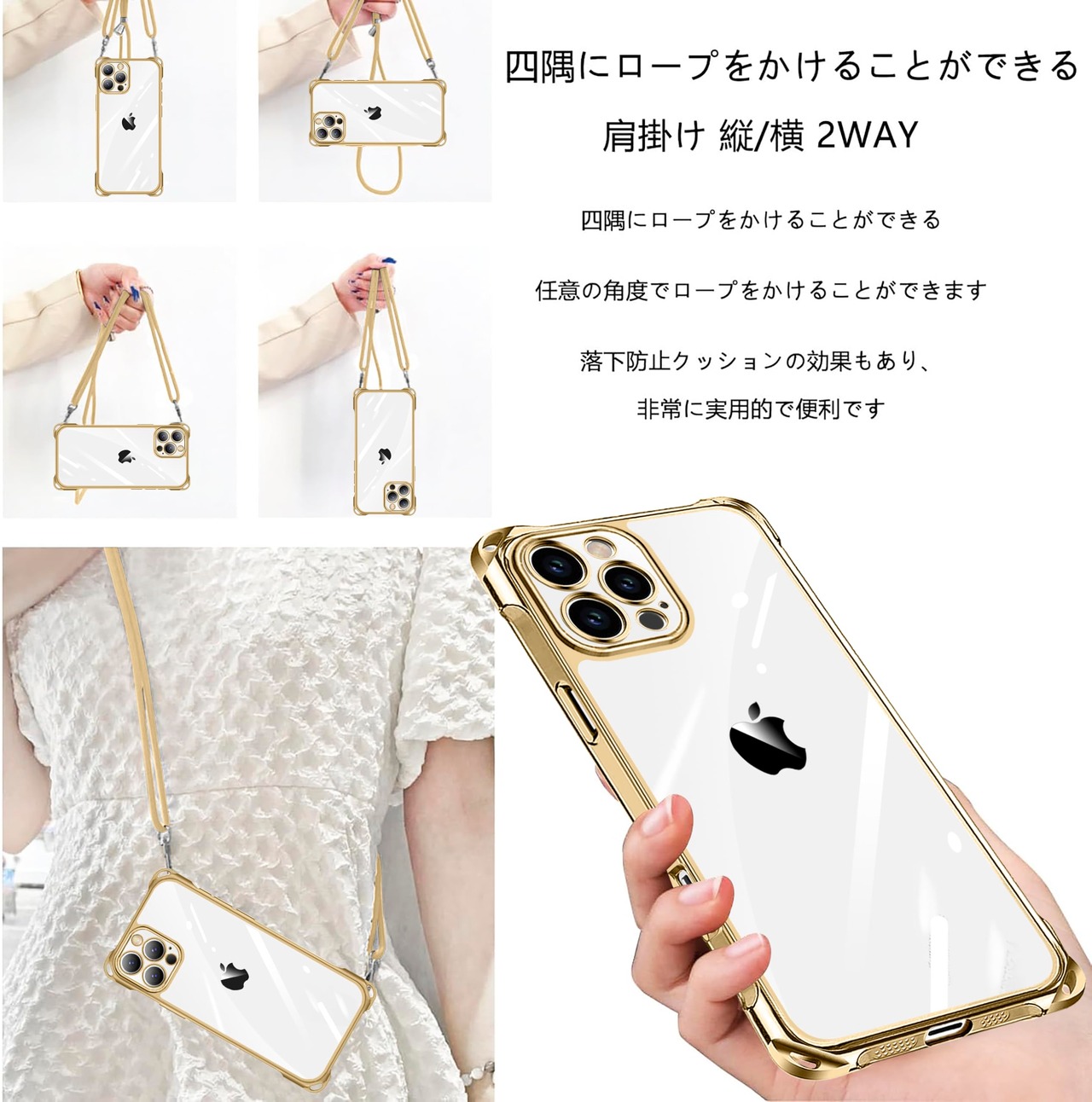 iPhone 16 Pro Max 用 ケース クリア ショルダー 耐衝撃 アイフォン16 Pro Max 用 スマホケース 透明 薄型 軽量 カバー 首かけ 肩掛け 縄掛けケース ストラップ付き 縦/横 2WAY 取り外し可能 長さ調整可能 ワイヤレス充電対応(ゴールド)
