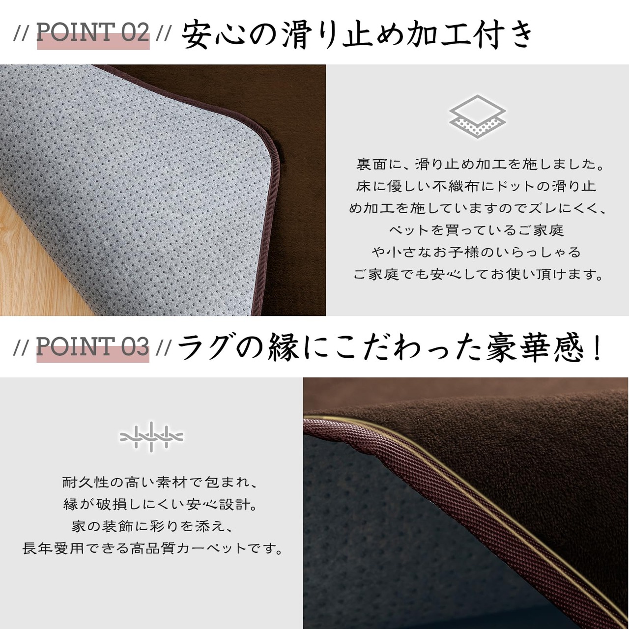 【フランネル素材・オールシーズン対応】 きめが細かく柔らかいマイクロファイバーを高密度で織り込みました。ふんわりと心地いい肌ざわりが特徴です。オールシーズン使えるフランネル素材絨毯が、光の加減や毛並みで色合いが変化します。