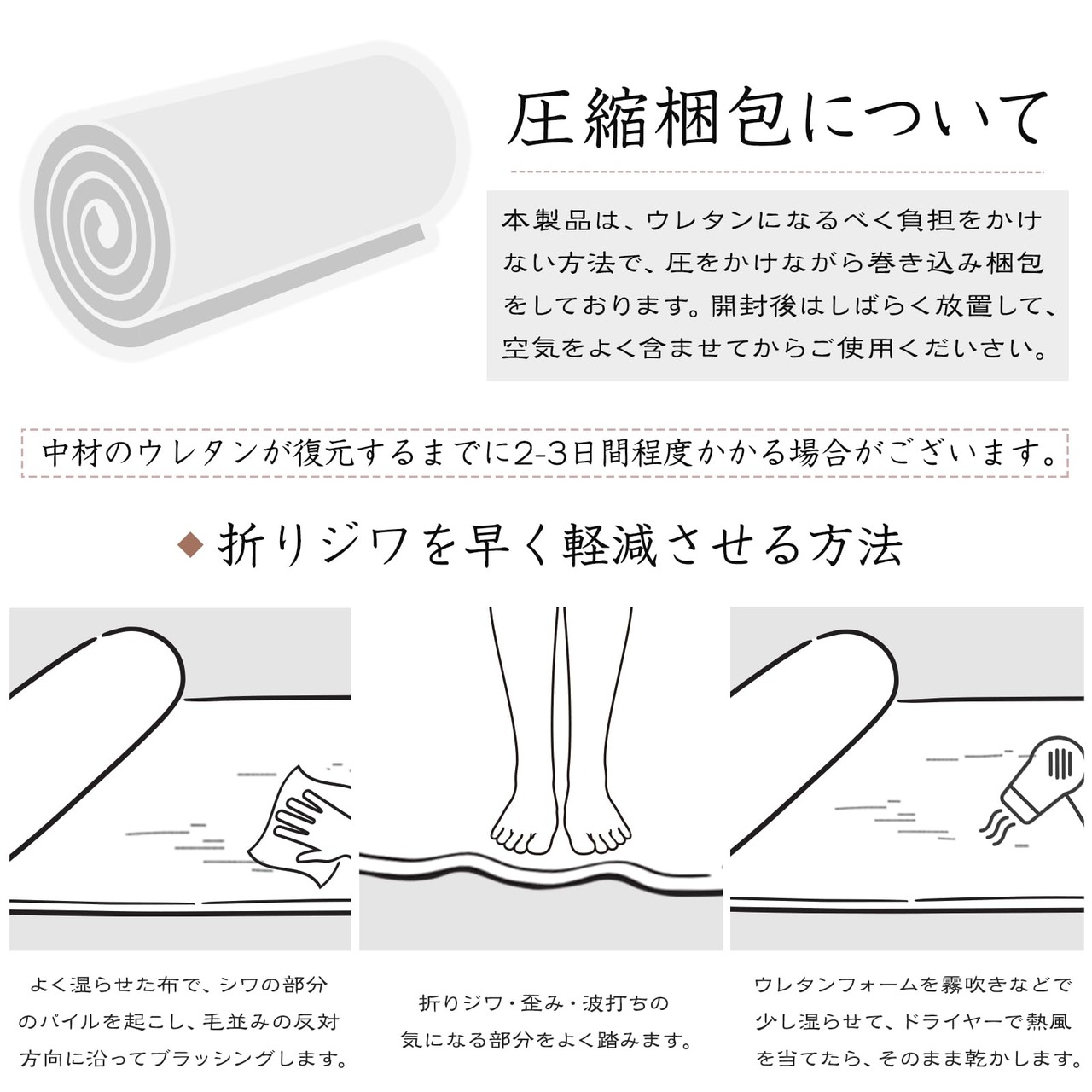 【抗菌防臭・安全安心】肌が直接触れるラグだからこそ、安心してお使いいただけるように菌の繁殖や、臭いを抑制する抗菌·防臭加工とダニの繁殖を抑制する効果のある防ダニ加工を施しています。当社の製品は薬剤等を使用して様々な加工を施しておりますが、身体に害になるような過剰な加工は、一切しておりません。低ホルマリン基準をクリアした当社の製品はアレルギーが気になる方やお子さまがいる家庭でも安心してお使いいただけます。