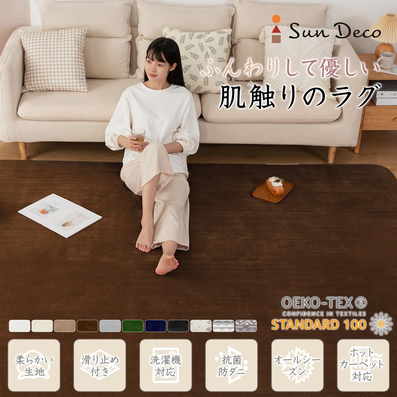 Sun Deco カーペット ラグ 洗えるラグマット 絨毯 200×250cm(約3畳) 抗菌 防臭 防ダニ 滑り止め付き オールシーズン 床暖房 ホットカーペット対応 丸洗い フランネル 無地・ブラウン