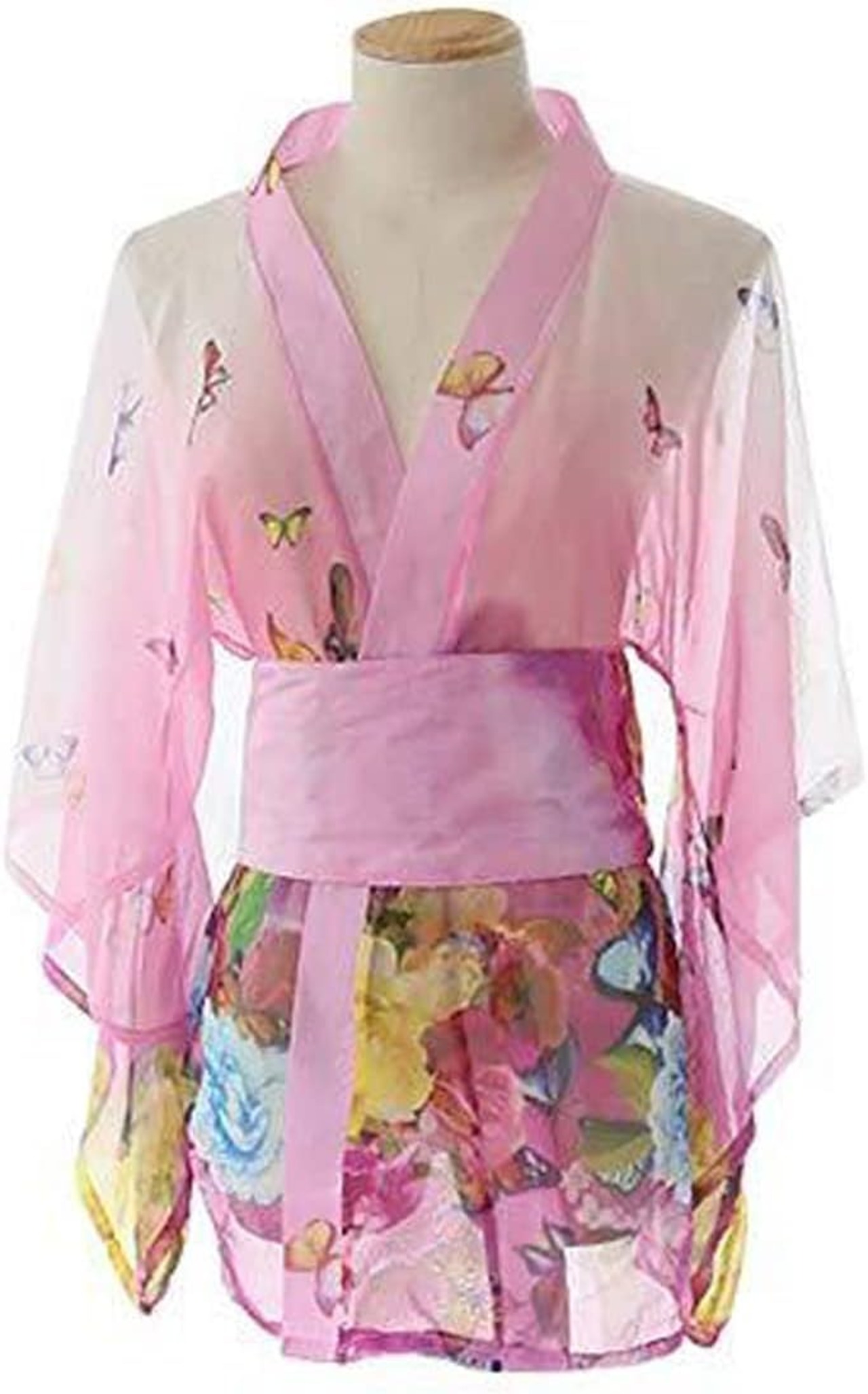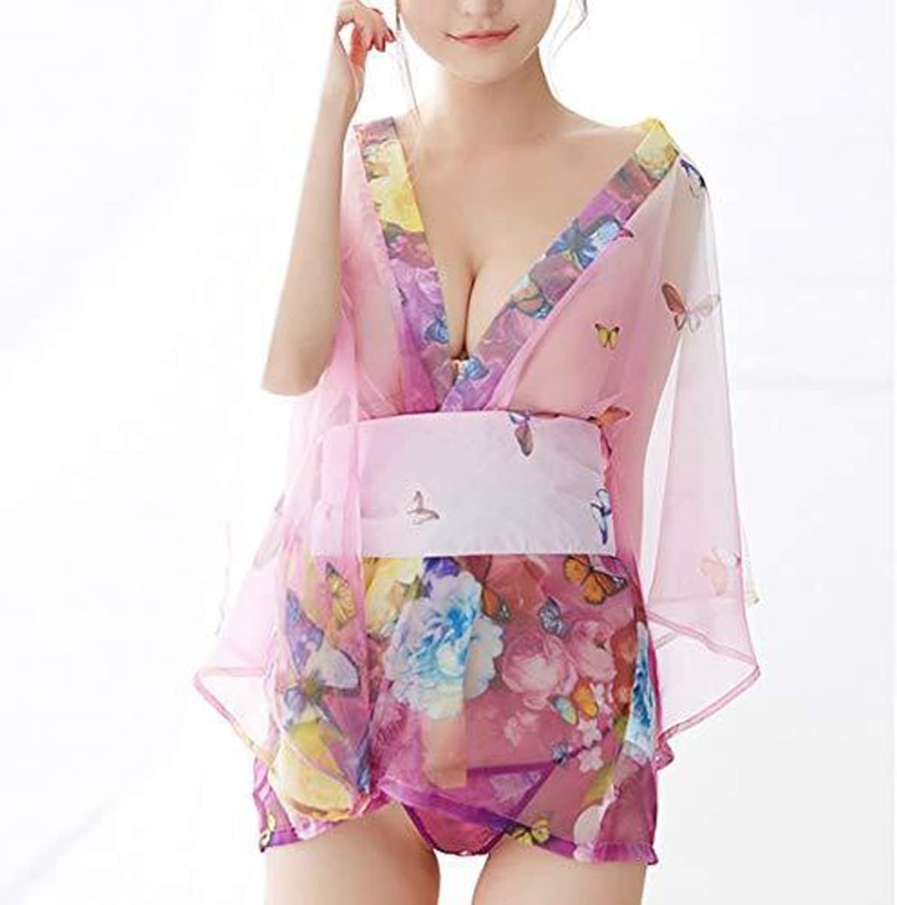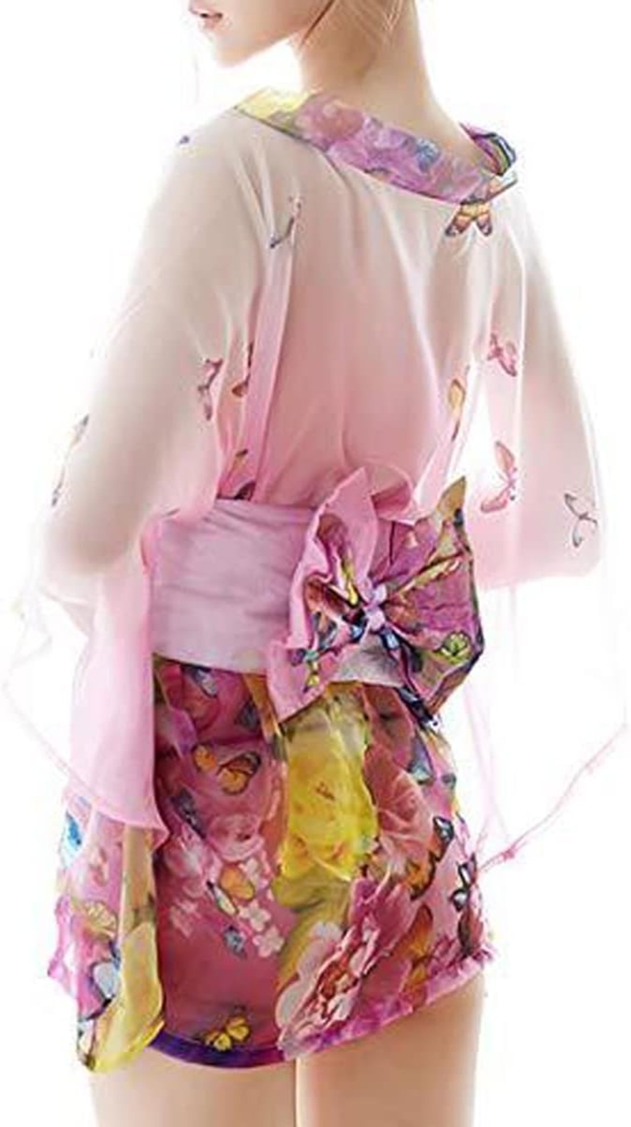 超セクシー ミニ着物ドレス 花魁 コスプレ コスチューム 和風 花柄 薄手 シースルー ミニ浴衣 ランジェリー 着物3点セット (花に舞う蝶(ピンク))