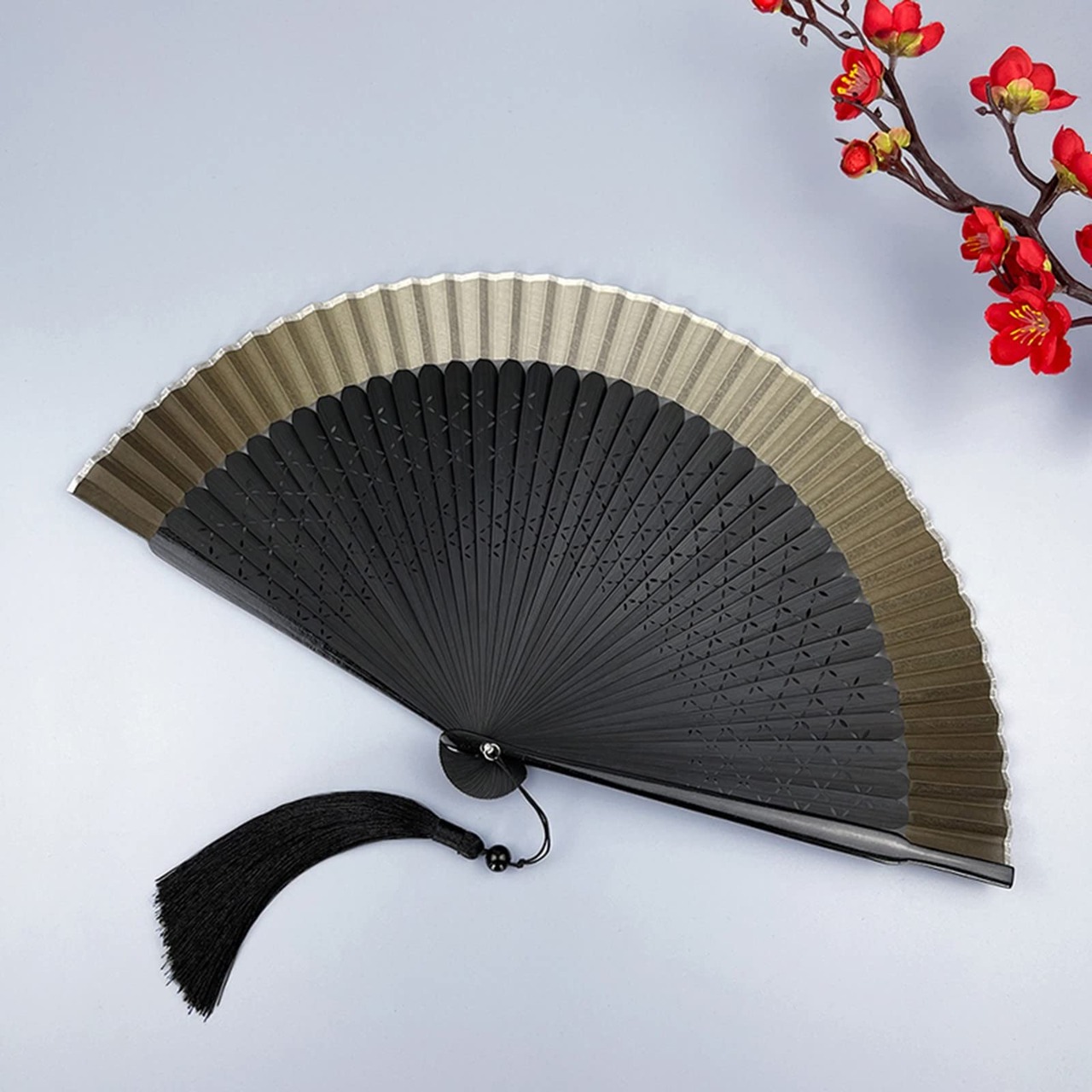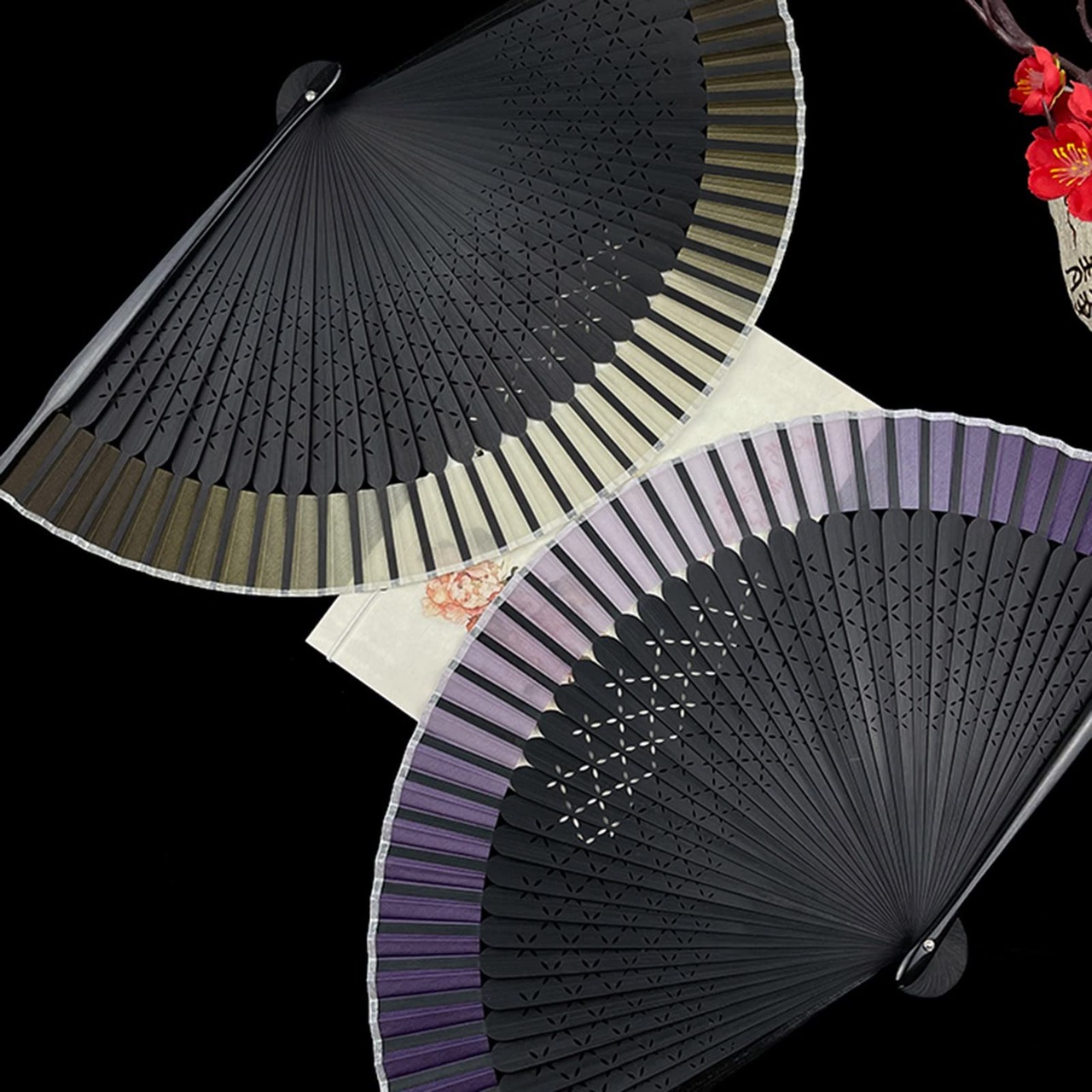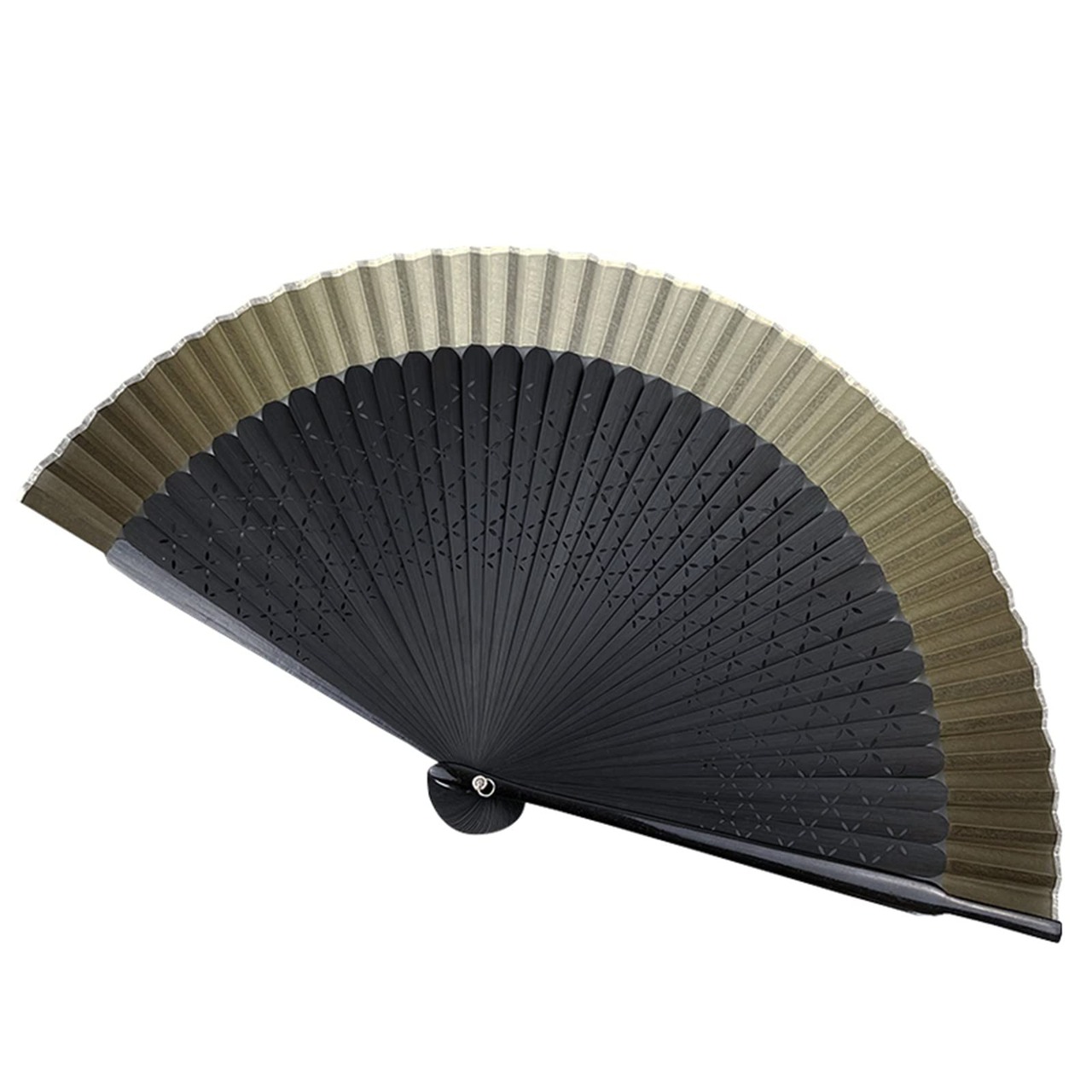 扇面は絹、頭は緑の竹の扇骨。グラデーションの染色、独創的なくり抜き、縁は真珠光沢のある塗料で大きく仕上げられています。