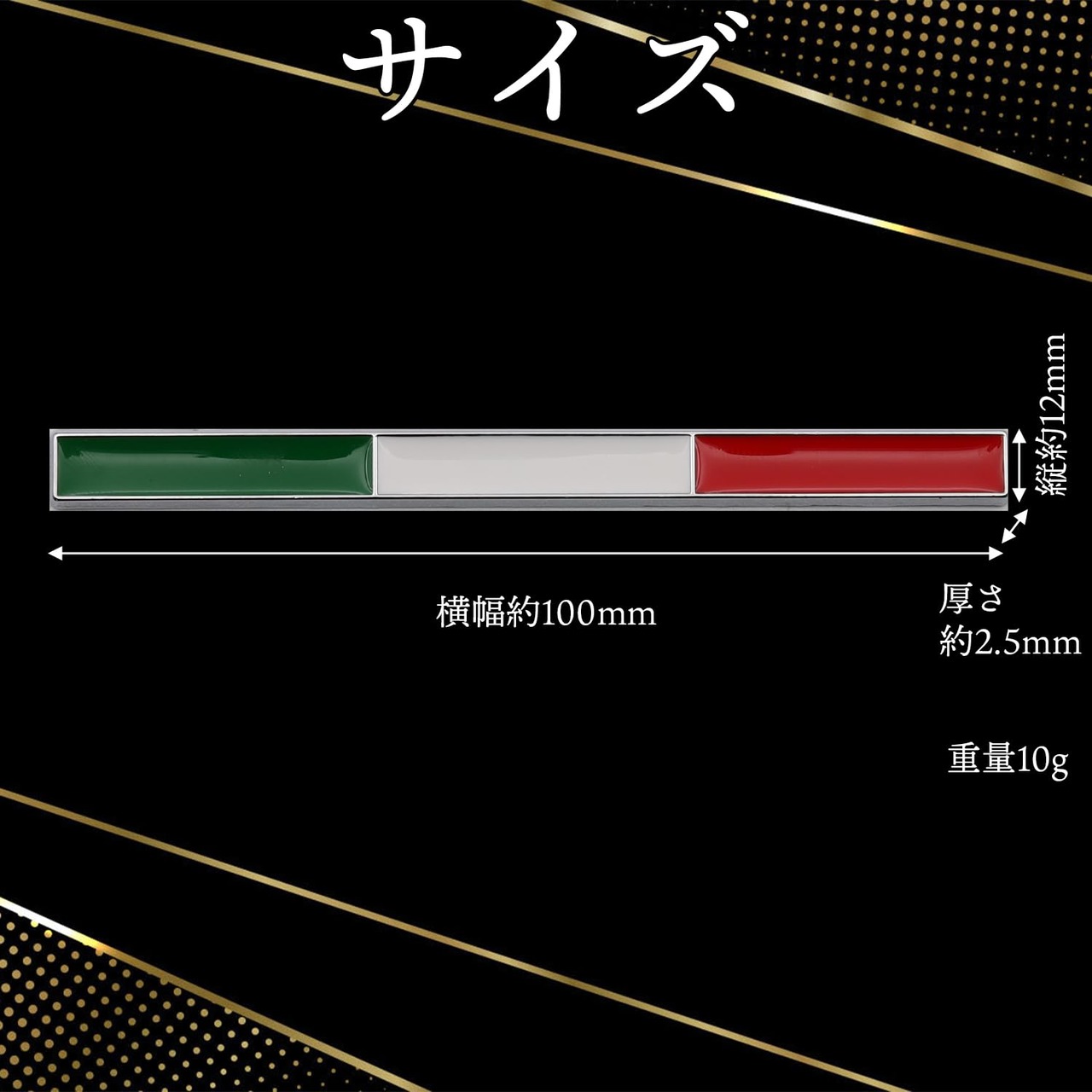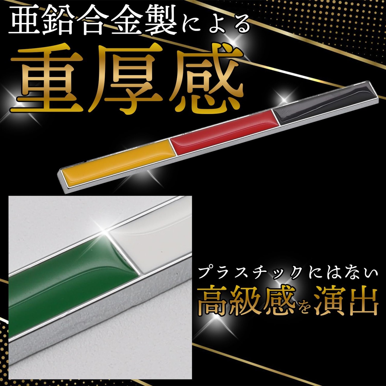 目立ちすぎず、でも確実に個性を表現するエンブレム(デカール)!あなたの愛車がひと味違う存在感を演出します!【亜鉛合金製】プラスチック製にはない重厚感!耐久性と高級感の両方をみたすアクセサリーで愛車をおしゃれにカスタマイズしましょう。【オシャレな国旗デザイン】ドイツ、イタリア、フランス3か国カラーのステッカーをご用意。各国メーカー車種に取り付けるのはもちろん、国産車にも当然お使いいただける汎用カー用品となります。【内装・外装どちらでも】車のフロント、フェンダー、サイドドア、バックドアなど外装ステッカーとして取り付けるのはもちろん、収納ボックスなどの内装カスタムにもお使いいただけます。【簡単取付】付属の両面テープ固定のみの簡単取付!工具不要でカスタマイズ初心者の方でも簡単に設置可能です。