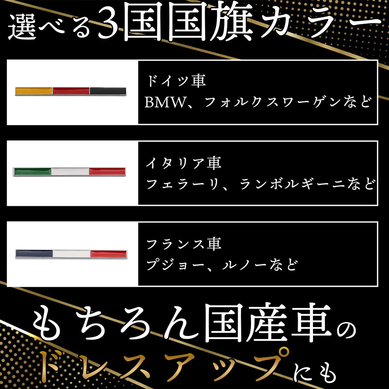 【オシャレな国旗デザイン】ドイツ、イタリア、フランス3か国カラーのステッカーをご用意。各国メーカー車種に取り付けるのはもちろん、国産車にも当然お使いいただける汎用カー用品となります。