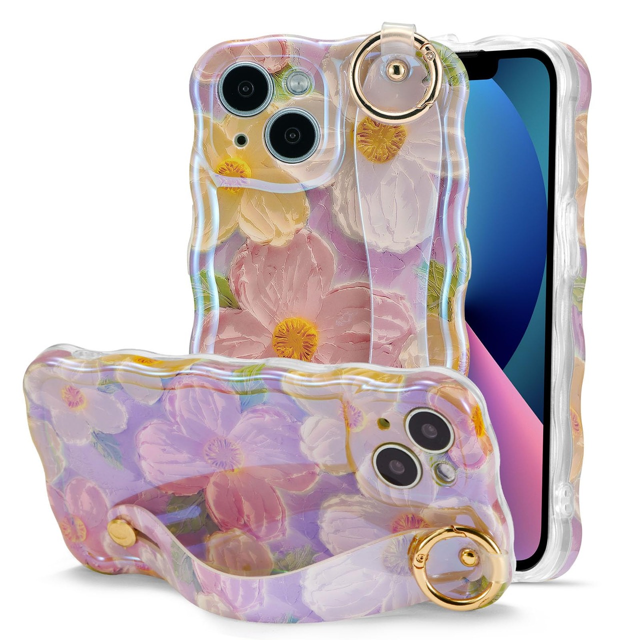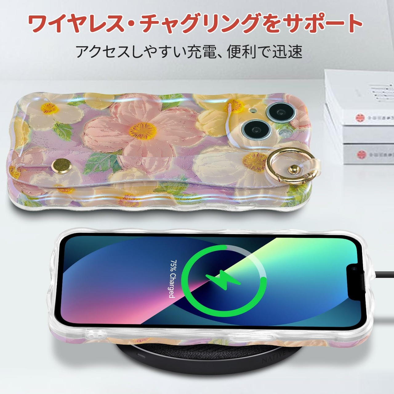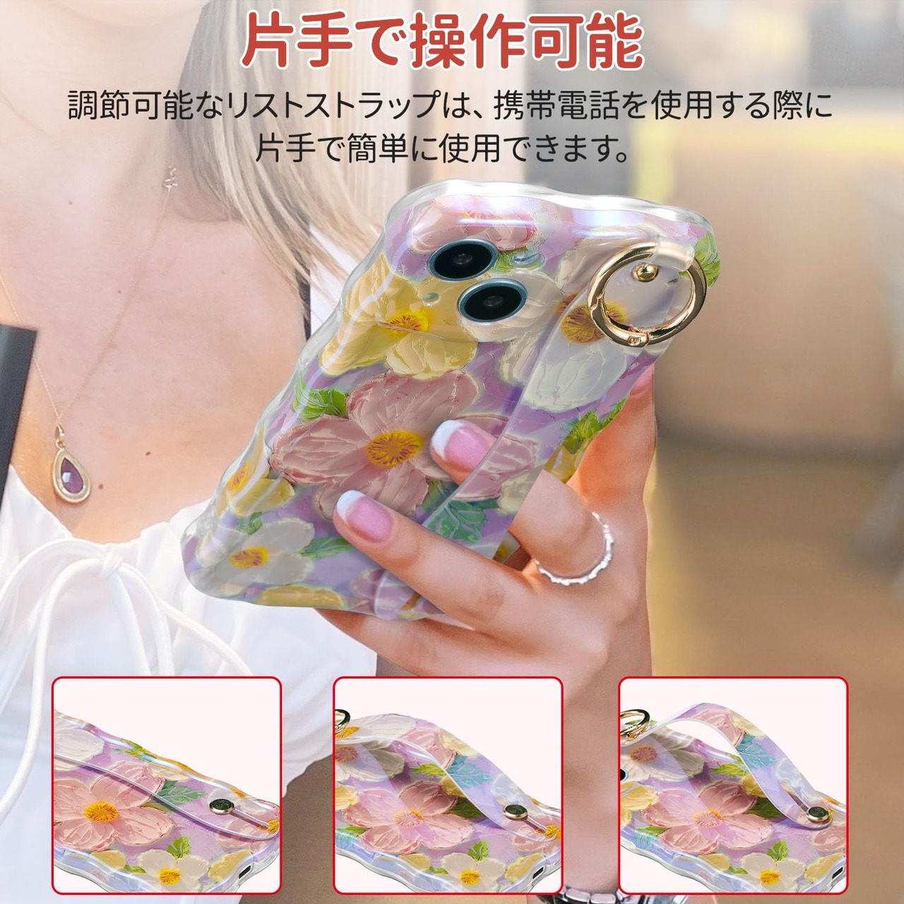 QLTYPRI iPhone 15 用 ケース TPUカバー ウェーブ おしゃれ 韓国 可愛い 花柄 薄型 軽量 耐衝撃 スマホケース ハンドベルト付き カラビナリング付き スタンド機能 ワイヤレス充電対応 ストラップホール付き アイフォン15 ケース 6.1インチ 対応 - ピンク