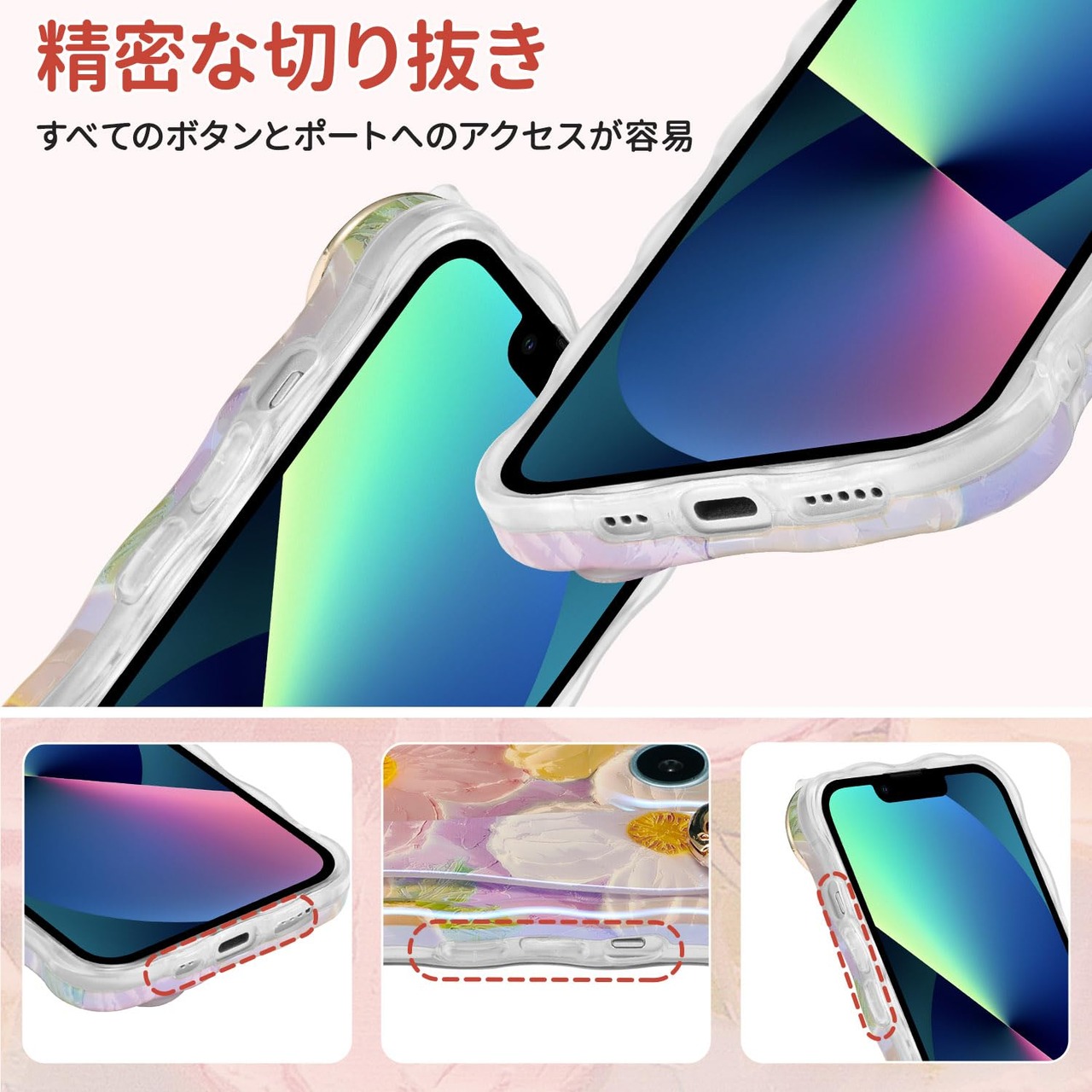【花柄デザイン ▪ フィット感】背面にカラフルな油絵の花柄、色味が優しく、いつものスマホに上品さをプラス。側面が透明なデザインからiPhone 15カラーが見えるデザインで、本来の美しさと高級感をそのままに映り出し。