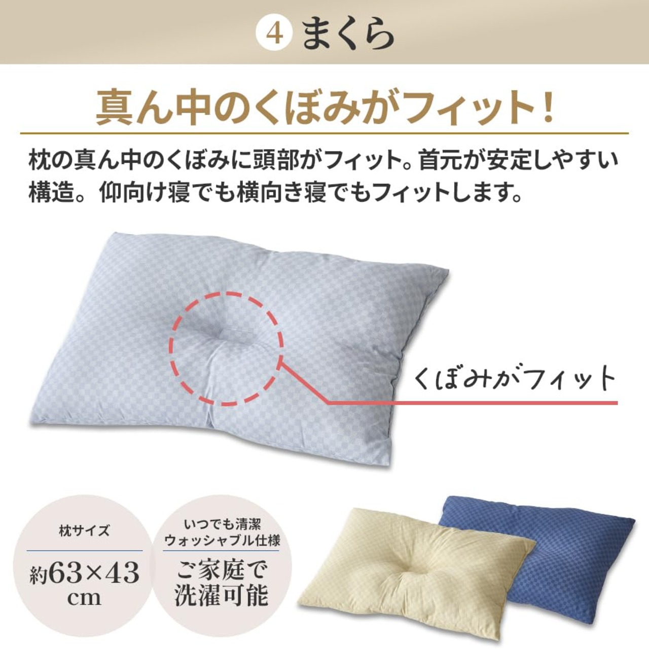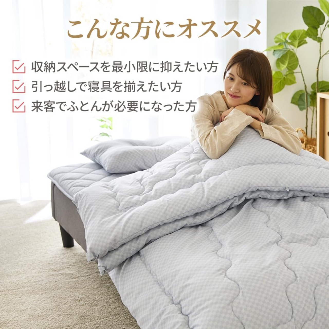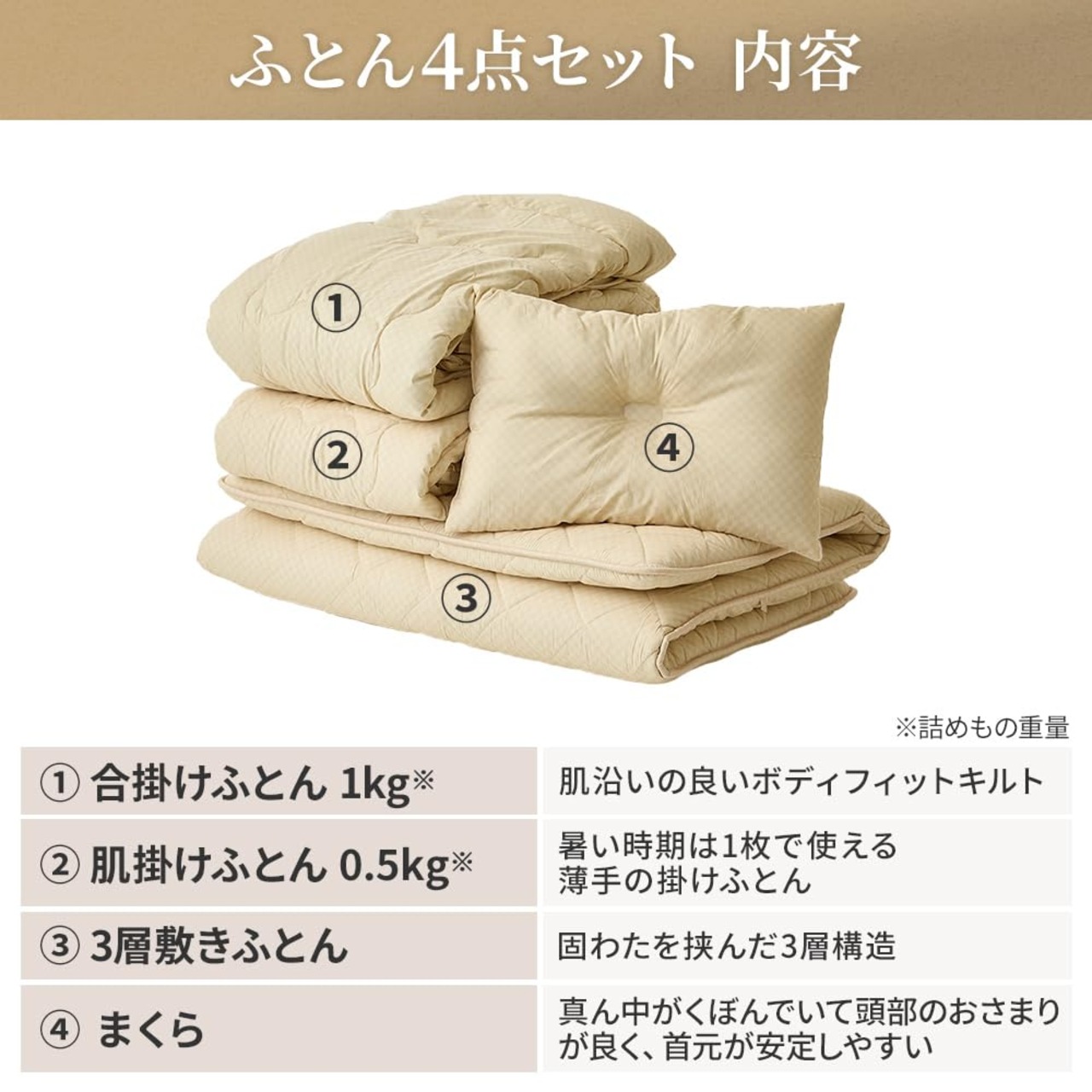 ◆掛けふとん×軽量掛けふとん◆ 【サイズ】シングルサイズ:150×210cm 【組成】側地:ポリエステル100% 詰め物:ポリエステル100% (肌掛け500g、合掛け1,000g 合計1.5kg) 掛けふとんは2枚合わせの掛けふとんが付属。1000gの掛けふとん(合掛け)と500gの軽量掛けふとん(肌掛け)の2枚が1つに合わさった掛けふとんです。極細繊維のポリエステルわたが暖かい空気を取り込みます。たっぷり空気を含んで、軽いのに暖かく使い勝手抜群です。肌添いのいいボディフィットキルトを採用し、気持ちの良い掛け心地の布団に仕上げています。2枚を分けて1枚ずつでの使用もできるので、365日ご使用する季節に応じてボリュームを調整することができます。 1000gの合掛けふとんは単品で初秋から初冬にかけて、500gの軽量掛けふとん(肌掛け)は1枚で春先から晩夏にかけて、単品でのご使用がおすすめです。ボリュームの異なる2枚を合わせれば保温性がUPし、冬も快適にお使いいただけます。 2枚合わせでご使用する時のために、2枚をひとつにまとめるスナップボタンが8カ所についているので、2枚がバラバラにならず快適にお使いいただけます。 ◆敷きふとん◆ 【サイズ】シングルサイズ:100×210cm【組成】ポリエステル100% 敷布団は1枚で使っても底つき感の少ないボリュームタイプ。ポリエステル綿で固わたを挟んだ3層構造で、合計4,000gと軽いのにしっかりしています。 ◆まくら◆ 【サイズ】約43×63cm【組成】ポリエステル100% 枕は真ん中がくぼんでいて首元が安定しやすく、軽くて取り扱いが簡単です。 ◆家庭で洗えて清潔◆掛けふとん・まくらはご家庭で洗濯できるのでいつでも清潔。汗ばむ時期も衛生的にご使用いただけます。※洗濯の際には商品の洗濯表示に沿ってお洗いください。※敷きふとんは洗えません ◆圧縮梱包無し◆この商品は圧縮梱包していませんので、圧縮により布団が潰れている等の心配はございません。開梱してすぐにご使用いただけますのでご安心ください。 【企画・デザイン】日本 【生産】中国