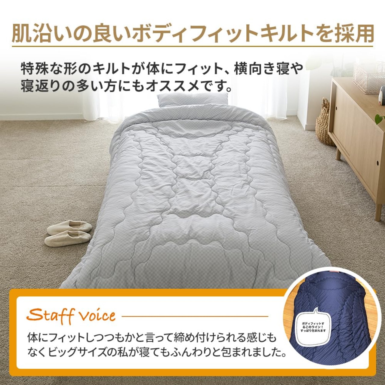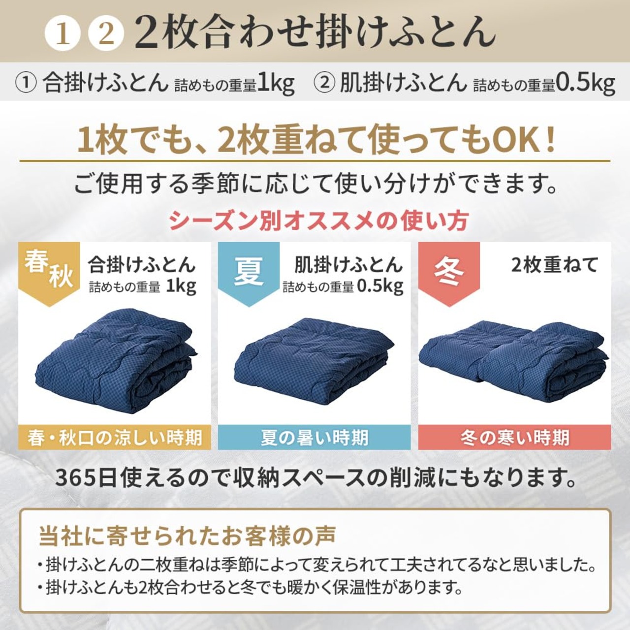 掛けふとんは2枚合わせの掛けふとんが付属。1000gの掛けふとん(合掛け)と500gの軽量掛けふとん(肌掛け)の2枚が1つに合わさった掛けふとんです。極細繊維のポリエステルわたが暖かい空気を取り込みます。たっぷり空気を含んで、軽いのに暖かく使い勝手抜群です。肌添いのいいボディフィットキルトを採用し、気持ちの良い掛け心地の布団に仕上げています。2枚を分けて1枚ずつでの使用もできるので、365日ご使用する季節に応じてボリュームを調整することができます。