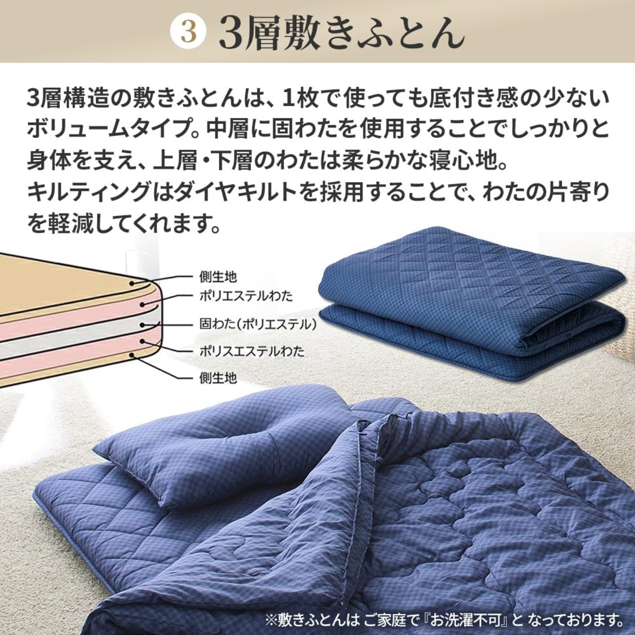 ◆敷きふとん◆【サイズ】シングルサイズ:100×210cm【組成】ポリエステル100% 敷布団は1枚で使っても底つき感の少ないボリュームタイプ。ポリエステル綿で固わたを挟んだ3層構造で、合計4,000gと軽いのにしっかりしています。