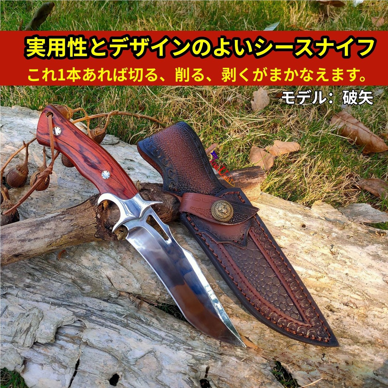 【特徴】安全に使用できるダブルヒルトのシースナイフです。ナイフを安全に持ち運べる専用革シースが付属。ドロップポイントブレードで、切る、削る、剥くがまかなえ、狩猟や魚釣り、キャンプなど幅広く使用できます。