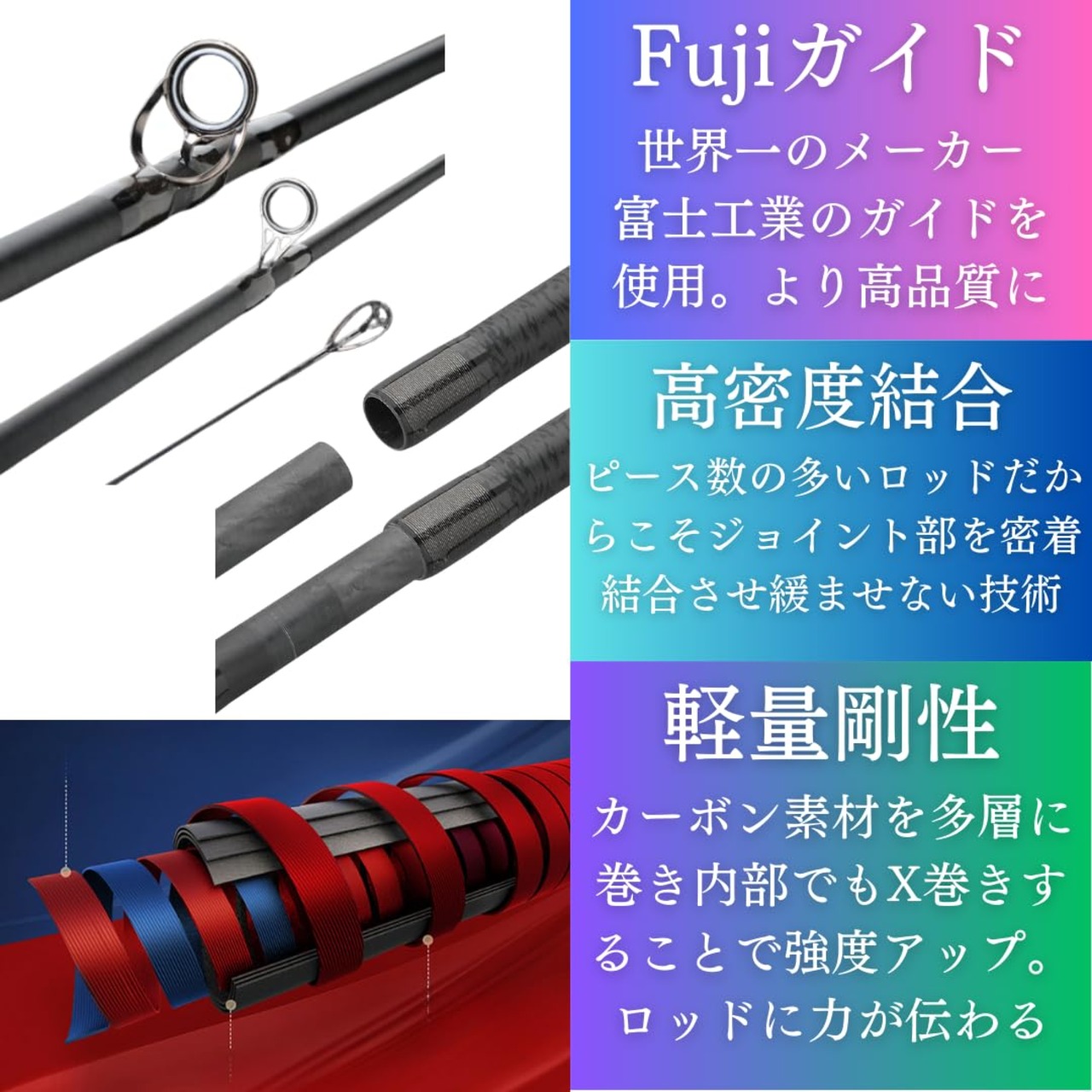 【剛性と操作性を両取り】 カーボン素材を高密度で使用し、ロッドの外側は多層に、内側は大手メーカーの上位種でも使用しているX巻きの技術で製造することでロッド自体の強度と竿に伝わる力を強化。より快適な操作を実現しました。
