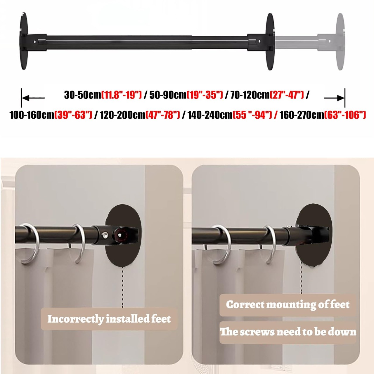 【多目的クローゼットポール】:当社のクローゼットホルダーは、さまざまな場所で使用できます。部屋の仕切り棒、洗濯室のハンガー棒、カーテン棒、シャワーカーテン棒、窓のロック棒、引き戸のセキュリティ棒などとして使用できます。