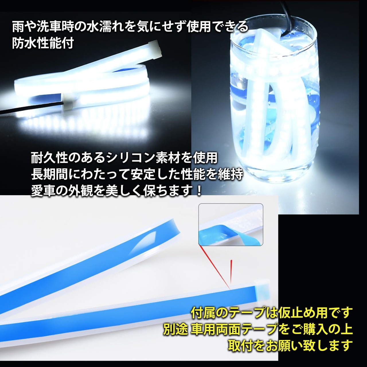 【防水性能】このLEDテープライトは防水仕様で、雨や洗車時の水濡れを気にせず使用できます。耐久性のあるシリコン素材を使用しているため、長期間にわたって安定した性能を維持し、車の外観を美しく保ちます。