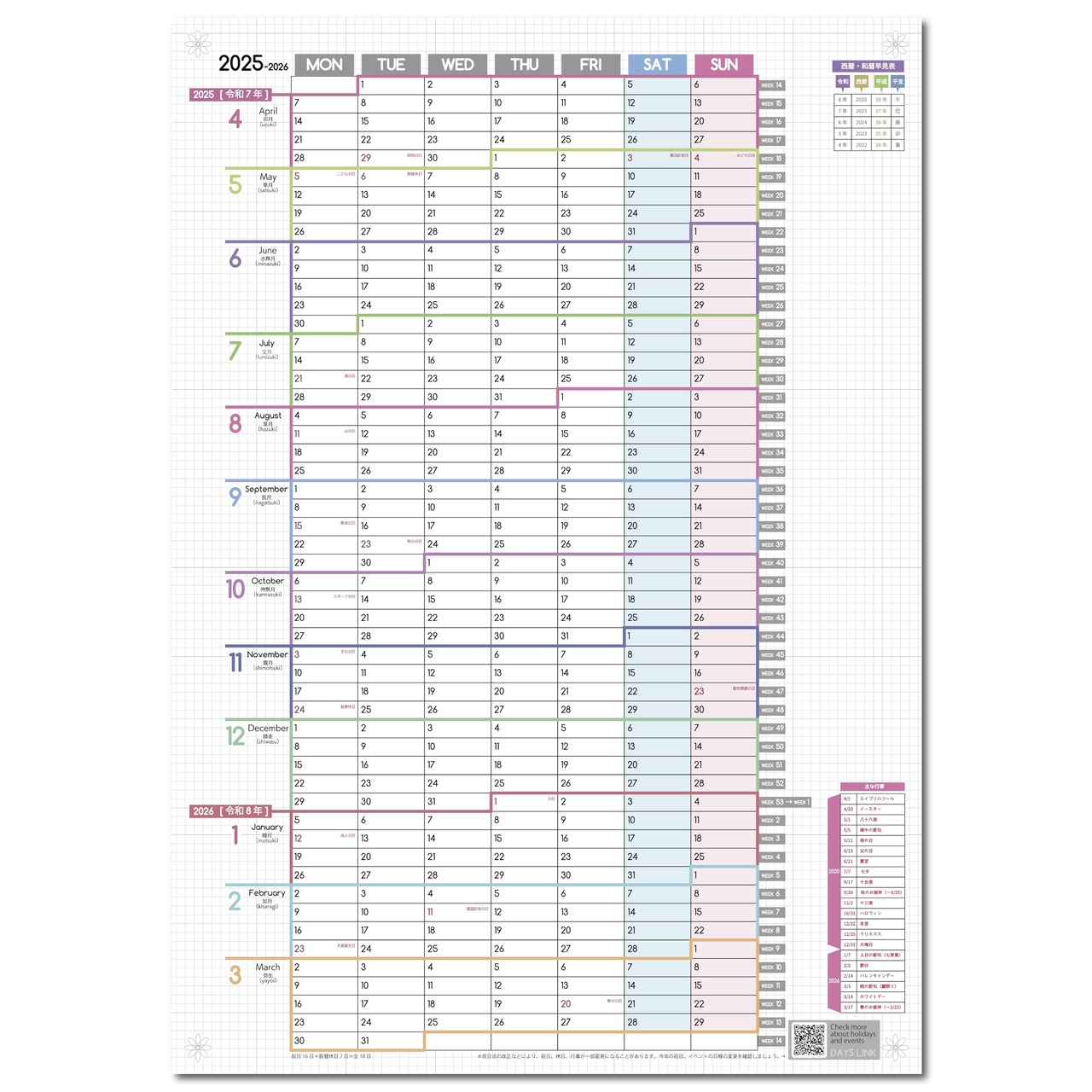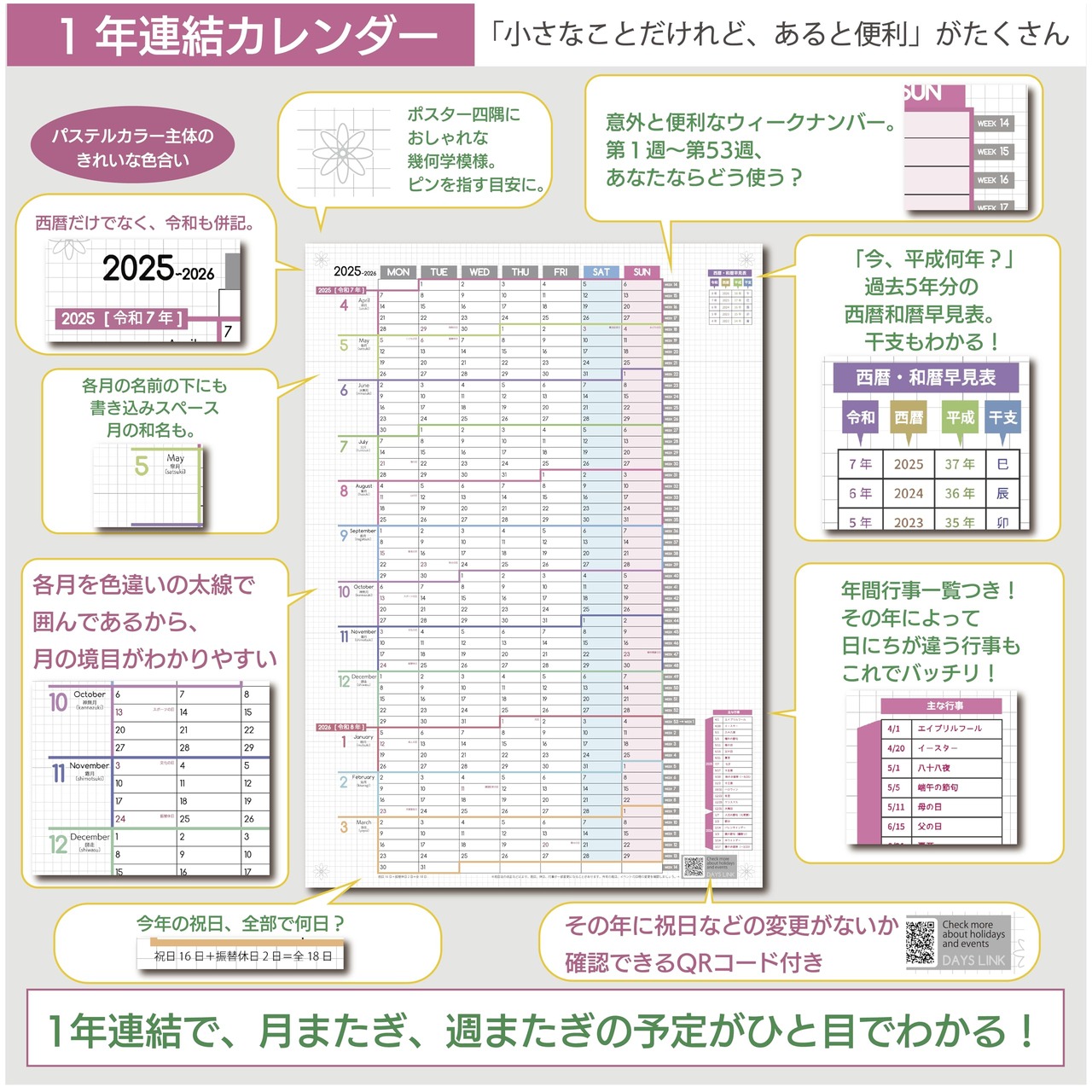 DAYS LINK 1年連結カレンダー ポスター 1枚 (2025年 4月始まり 月曜始まり) 大きい 壁掛け 令和7年 1Y-25-04MON (パステル, 標準(A2))