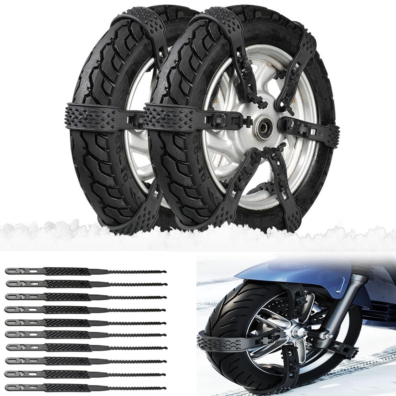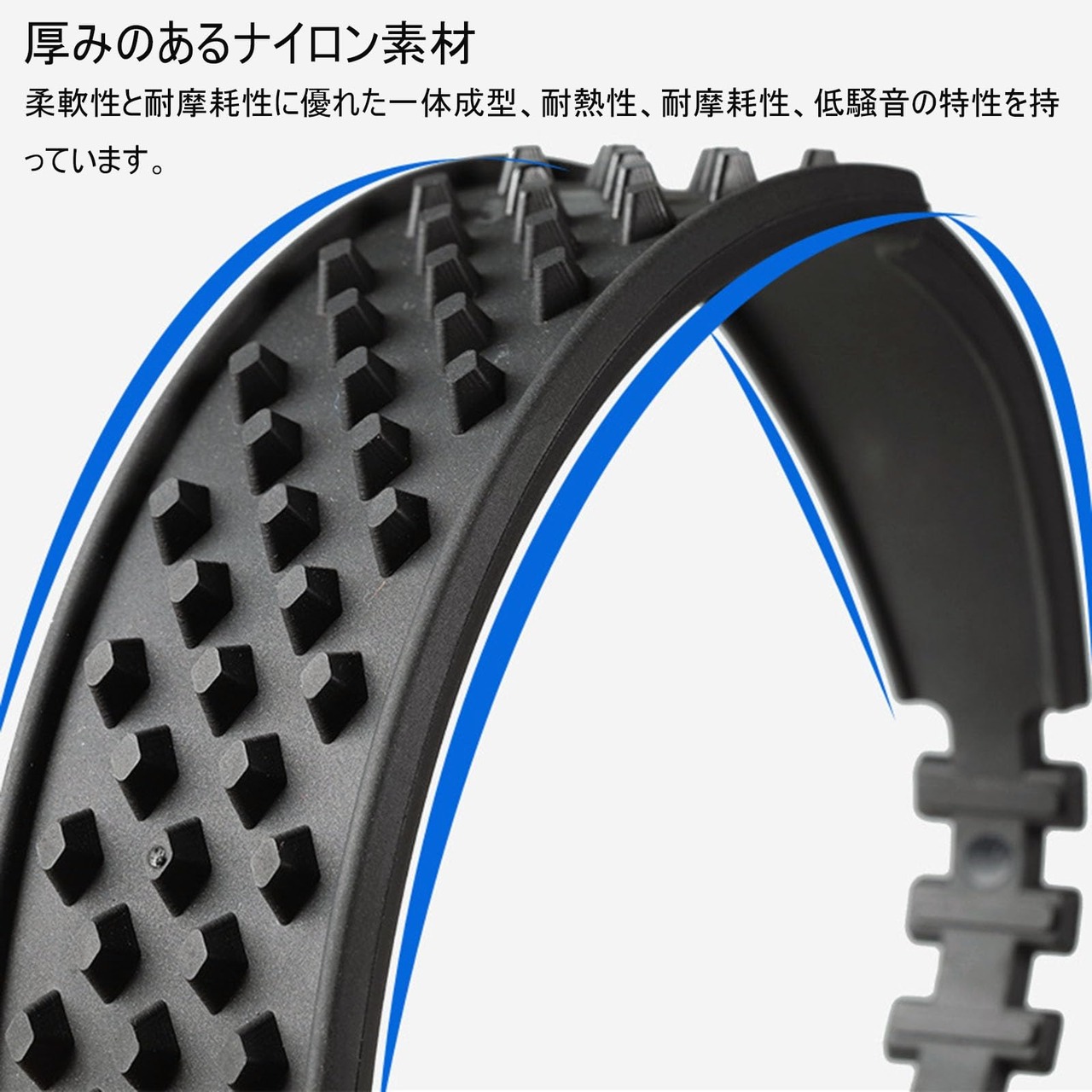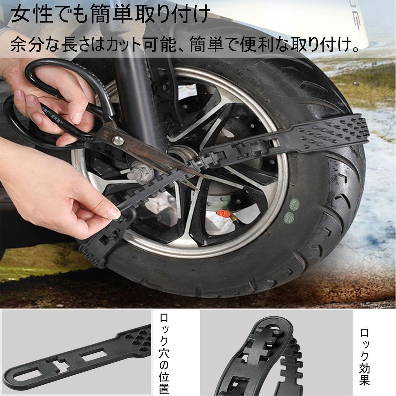 【耐久性のある素材】オートバイの滑り止めチェーンはナイロン素材寒冷地用熱可塑性ゴムの高密度一体射出成形で作られています。素材はよりタイトで破損しにくく、耐寒性、耐摩耗性、耐老化性、ノイズ低減、バンプ防止の特性を備えており、金属と比較して、タイヤに損傷を与えず、丈夫です。落ちやすい。