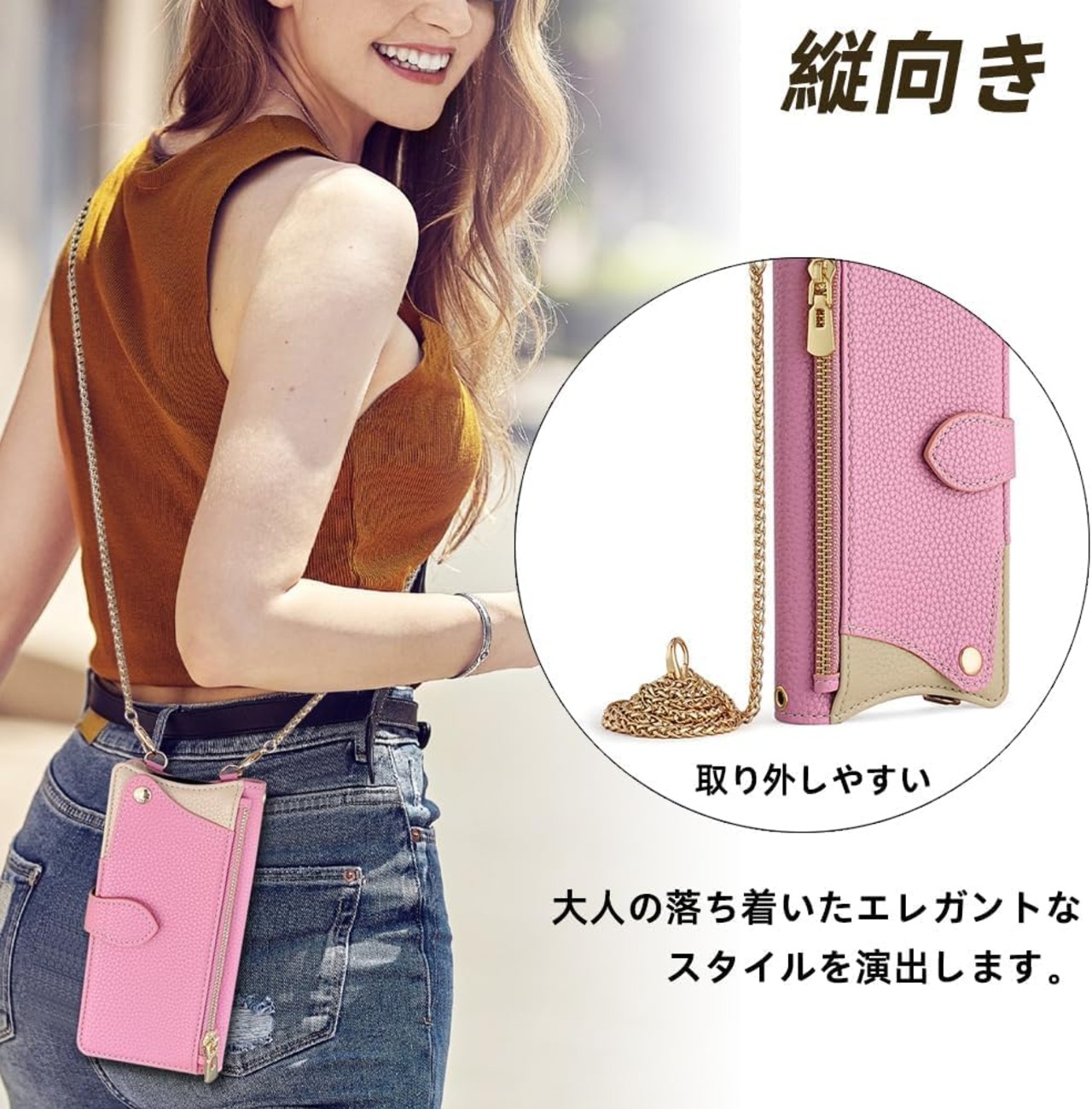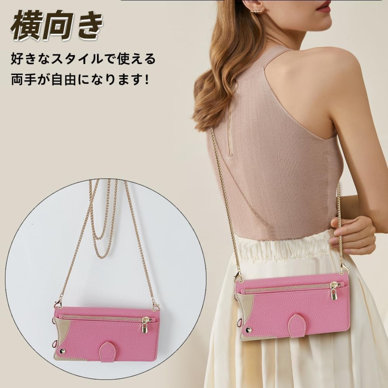 快適な持ち心地と使いやすさ: 付属クロスボディチェーン、全長120 cm。金具の装飾が美しさと上品さを漂わせてます。斜めがけ、肩掛け、通勤、旅行、犬の散歩、山登り、海へ行く、買い物、外食、重い荷物を持っている時、子供を連れて外出する時もスマホを紛失すること心配なく両手が解放されます。また、マグネット式の留め具により、片手で簡単に開閉ができ、スタンド機能も兼ね備えています。