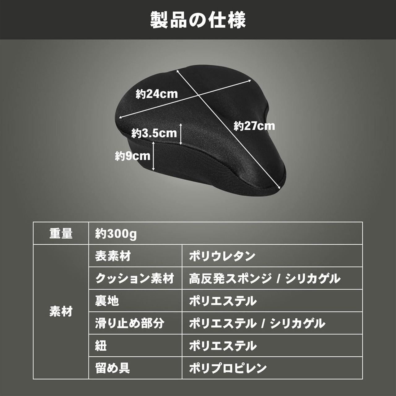 【製品の仕様】:サイズ:長さ:約27cm × 幅:24cm × 高さ:9cm(厚さ+3.5cm)、重量 :約300g、パッケージ内容: STEADY スピンバイク用 サドルカバー(本体)