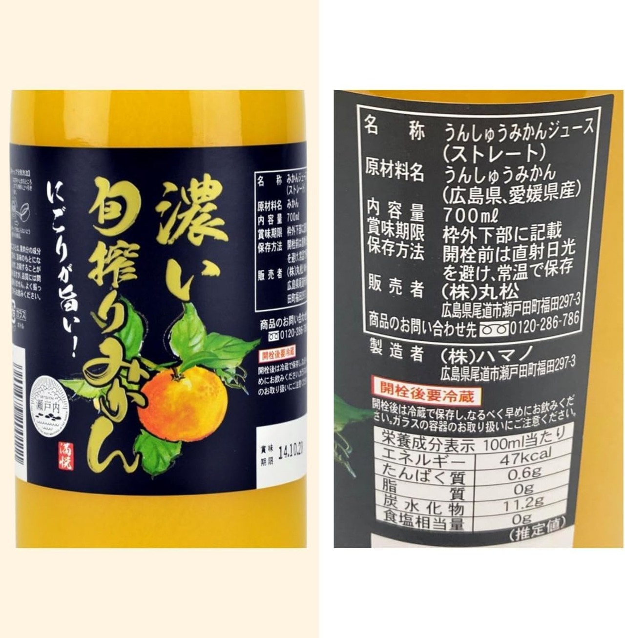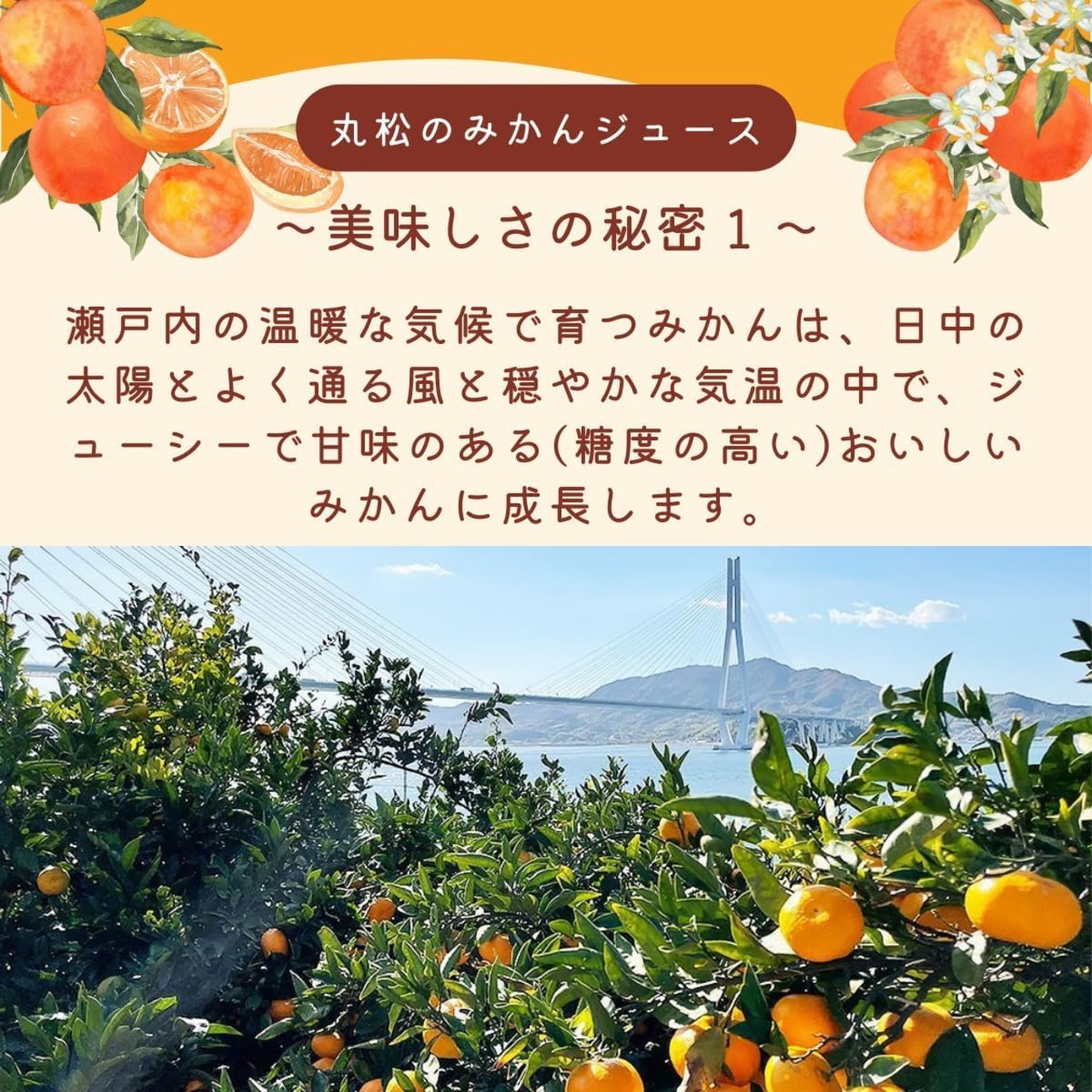 瀬戸内の温暖な気候で育つみかんは、日中の太陽とよく通る風と穏やかな気温の中で、ジューシーで甘味のある(糖度の高い)おいしいみかんに成長します。 その新鮮な旬のみかんを搾ったままの100%ストレートジュースなので、香りもよくおいしく召し上がっていただけます。また、独自の製法で、果肉の成分を多く残し、より濃厚な味に仕上げています。