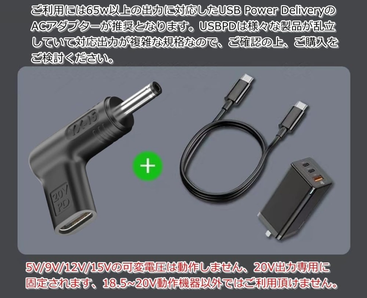 ※ 当製品は電圧を20Vに固定していますので、通常のUSB-PD対応製品のように5/9/12/15Vなどの電圧の可変ができません、18.5V-20V動作の製品(パソコン)以外への使用は、ご利用者の責任管理の元で運用をお願いいたします。