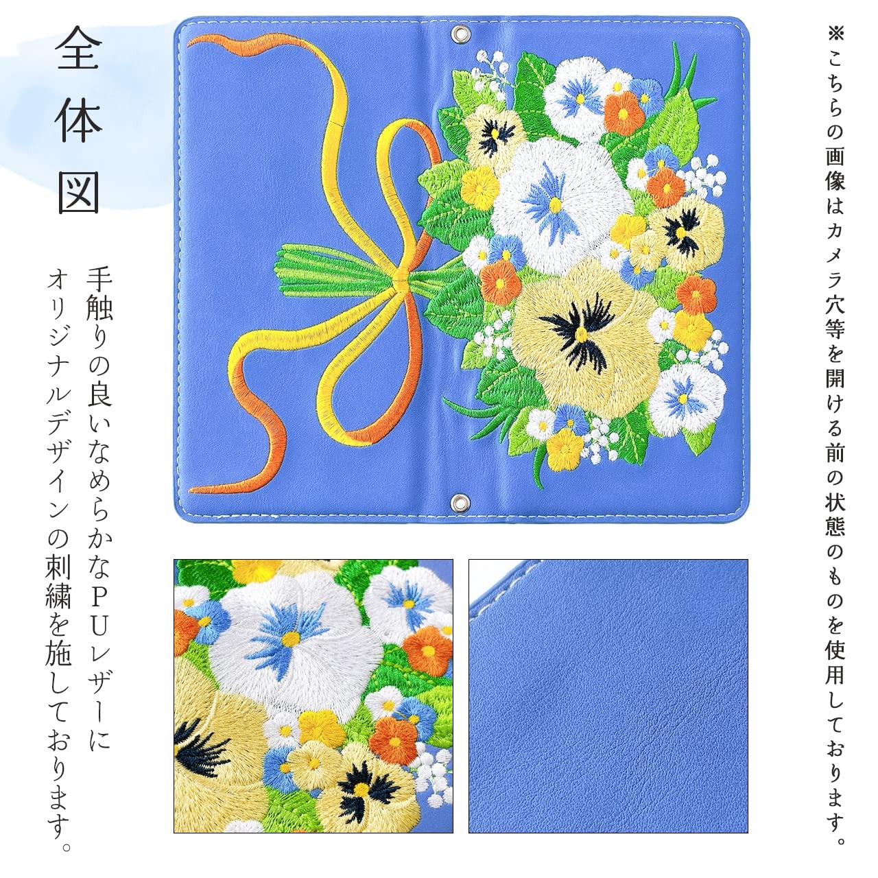 ノーブランド品 らくらくスマートフォン F-53E 専用 フリップケース(ストラップ付き) ブルー パンジー刺繍 手帳型 ケース