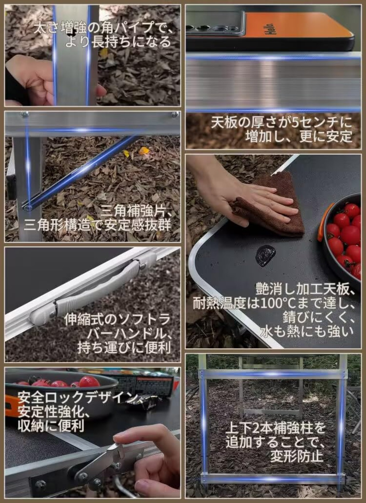 ✅【素材】材質:フレーム/アルミニウム、他、天板/メラミン加工合板(抗菌加工) 。天板の耐熱温度は100℃まで達し、錆びにくく、水と熱にも強いので、鍋やフライパンなどの熱い物を置いたりご使用頂けます。おしゃれな見た目でお手入れも簡単、水や汚れもすぐ落ち、実用性と耐久性を両立しています。手触りがよく、滑り止めだけでなく美しい。人気の木目調素材を採用し、ナチュラルスタイルでよく馴染みます。お部屋でもキャンプでもこれひとつでばっちり。