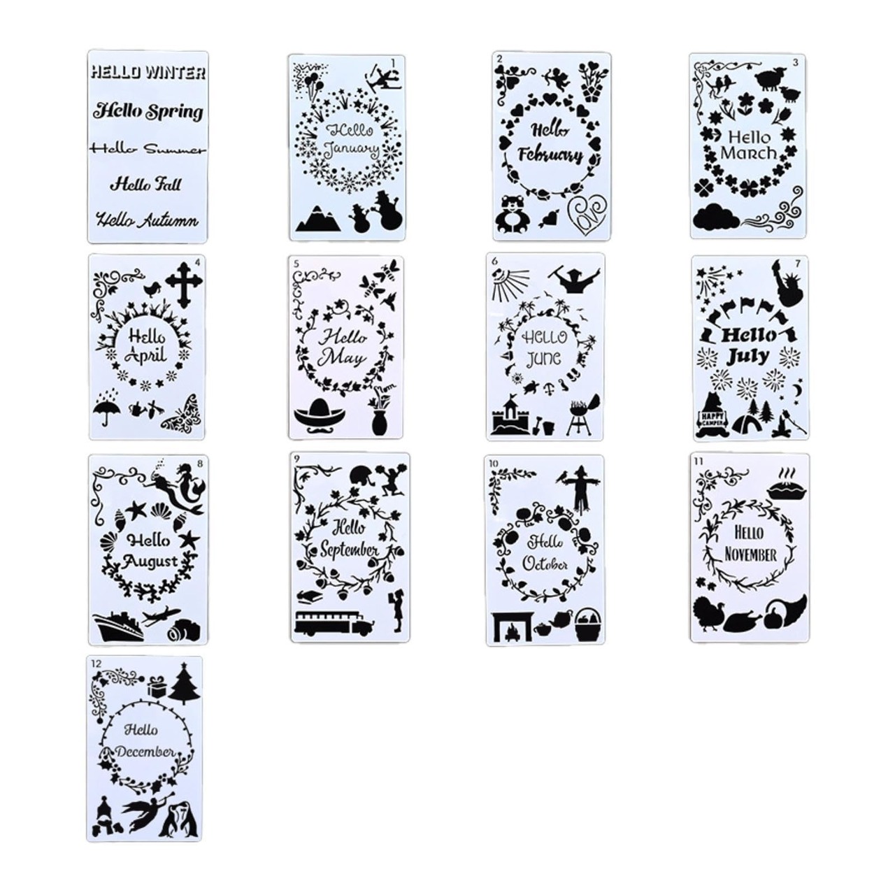 【包括的なセット】:この毎月のジャーナルステンシルキットには、1月から12月までの毎月のテーマテンプレートが含まれており、DIYプロジェクトにさまざまなオプションを提供します