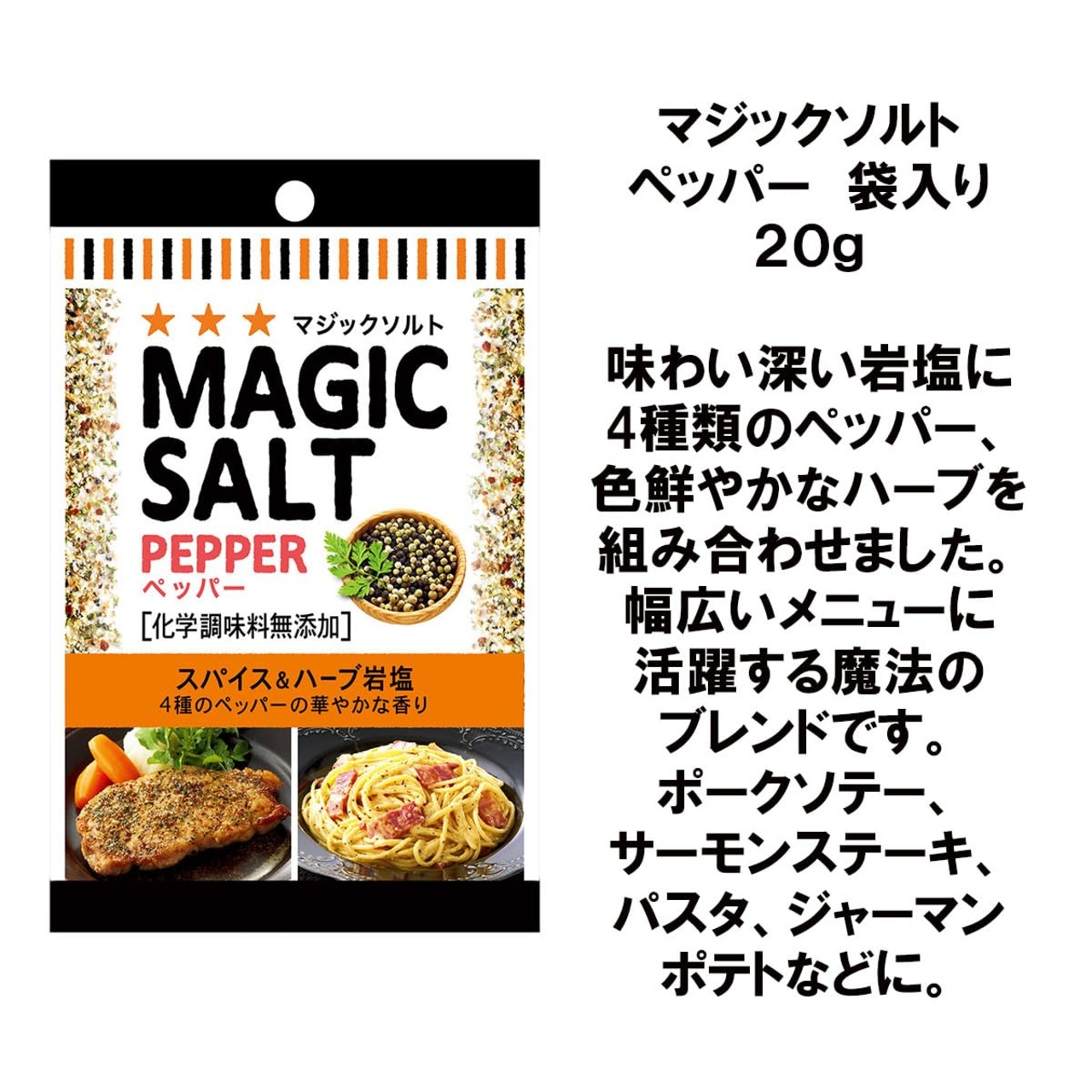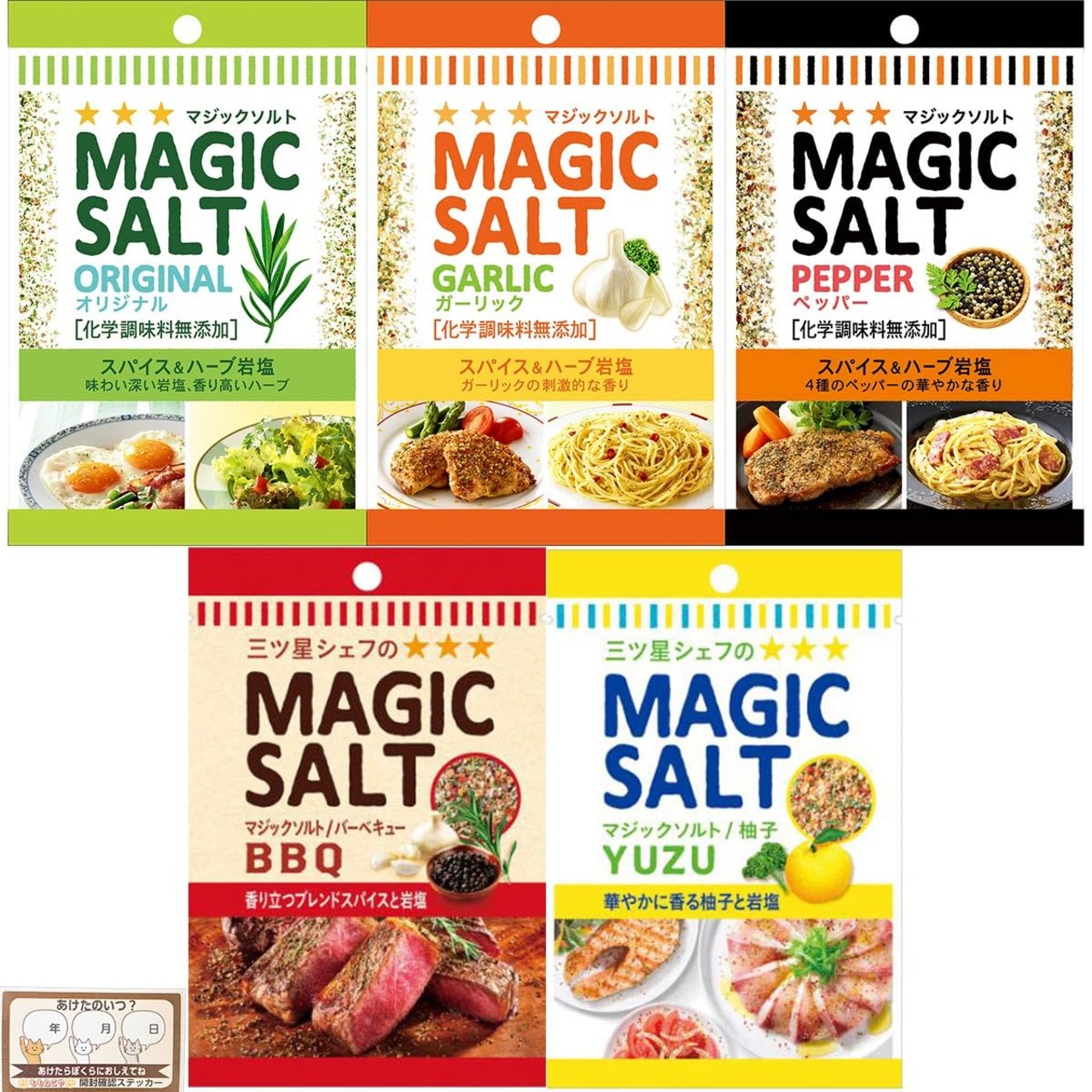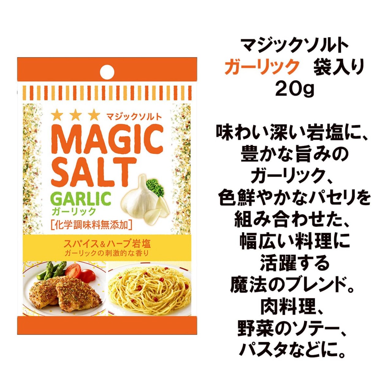 ●オリジナル<br> 味わい深い岩塩に香り高いハーブや色鮮やかなトマトパウダーを組み合わせました。<br> 料理の下ごしらえから仕上げまで活躍する魔法のブレンドです。<br> サラダ、卵料理、魚や肉のソテー、パスタなどに。<br> 原材料名<br> 食塩(岩塩(アメリカ))、ホワイトペッパー、砂糖、すりごま、トマトパウダー、パセリ、フライドオニオン、ガーリック、タラゴン、チャイブ/加工デンプン、(一部にごまを含む)<br> 栄養成分表示 100gあたり<br> エネルギー:177kcal、たんぱく質:5.1g、脂質:4.0g、炭水化物:30.2g、食塩相当量:53.3g<br> アレルギー成分:ごま<br><br> ●ガーリック<br> 味わい深い岩塩に豊かな旨みのガーリック、色鮮やかなパセリを組み合わせました。<br> 幅広いメニューに活躍する魔法のブレンドです。<br> 野菜や肉のソテー、パスタ、ガーリックライスなどに。<br> 原材料名<br> ローストガーリック(国内製造)、食塩(岩塩)、ガーリック、ホワイトペッパー、パセリ、チリーペッパー、(一部に大豆を含む)<br> 栄養成分表示 100gあたり<br> エネルギー:258kcal、たんぱく質:11.5g、脂質:1.9g、炭水化物:48.8g、食塩相当量:30.5g<br> アレルギー成分:大豆<br><br> ●柚子<br> 味わい深い岩塩に、華やかな香りの柚子を組み合わせた、<br> 魚介や野菜料理を中心に幅広く使える魔法のブレンド。<br> カルパッチョ、サラダ、肉料理などに。<br> 原材料名<br> 食塩(岩塩(アメリカ))、ちんぴ、すりごま、ホワイトペッパー、砂糖、チリーペッパー、ゆず、ガーリック、パセリ、カフェライムリーフ、マッシュルームエキスパウダー、レモンパウダー、山椒/トレハロース、(一部にごまを含む)<br> 栄養成分表示 100gあたり<br> エネルギー:232kcal、たんぱく質:6.4g、脂質:6.7g、炭水化物:36.4g、食塩相当量:43.2g<br> アレルギー成分:ごま<br><br> ●バーベキュー<br> 味わい深い岩塩に、ペッパーやガーリックなどのスパイス・ハーブを組み合わせた、<br> 肉料理を中心に幅広く使える魔法のブレンド。ステーキ、ハンバーグ、魚介のソテーなどに。<br> 原材料名<br> 食塩(岩塩(アメリカ))、砂糖、ローストガーリック、パセリ、ブラックペッパー、フライドオニオン、燻製ブラックペッパー、チリーペッパー、マスタード、ホワイトペッパー、ナツメッグ、コリアンダー、トマトパウダー、セージ、クミン、タイム、オレガノ、ローズマリー/加工デンプン、(一部に大豆を含む)<br> 栄養成分表示 100gあたり<br> エネルギー:240kcal、たんぱく質:7.5g、脂質:4.8g、炭水化物:41.8g、食塩相当量:35.6g<br> アレルギー成分:大豆<br><br> ●ペッパー<br> 味わい深い岩塩に4種類のペッパー、色鮮やかなハーブを組み合わせました。<br> 幅広いメニューに活躍する魔法のブレンドです。<br> ポークソテー、サーモンステーキ、パスタ、ジャーマンポテトなどに。<br> 原材料名<br> 食塩(岩塩(アメリカ))、ブラックペッパー、砂糖、ホワイトペッパー、グリーンペッパー、チリーペッパー、トマトパウダー、ちんぴ、フライドオニオン、すりごま、ガーリック、パセリ、チャービル/加工デンプン(一部にごまを含む)<br> 栄養成分表示 100gあたり<br> エネルギー:201kcal、たんぱく質:5.7g、脂質:2.6g、炭水化物:38.6g、食塩相当量:48.3g<br> アレルギー成分:ごま