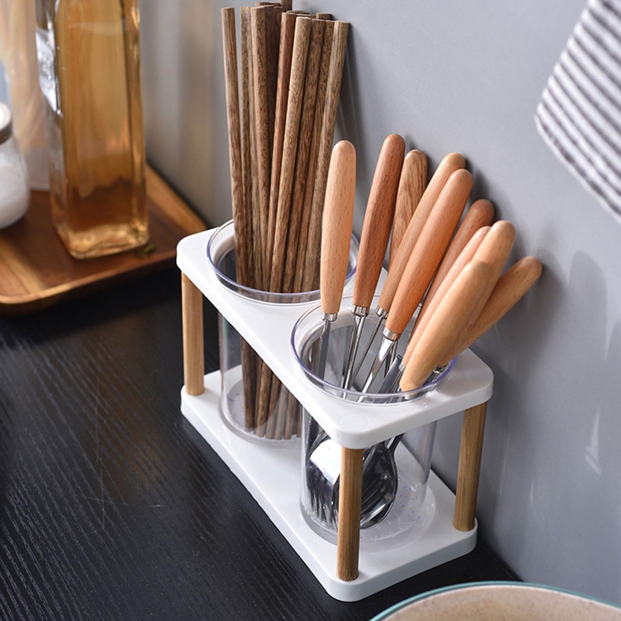 ユーザーフレンドリーな竹のラックと頑丈な箸ホルダーでキッチンを整理します。