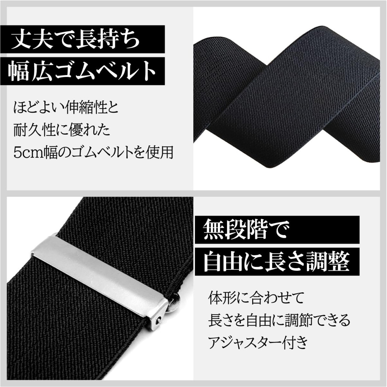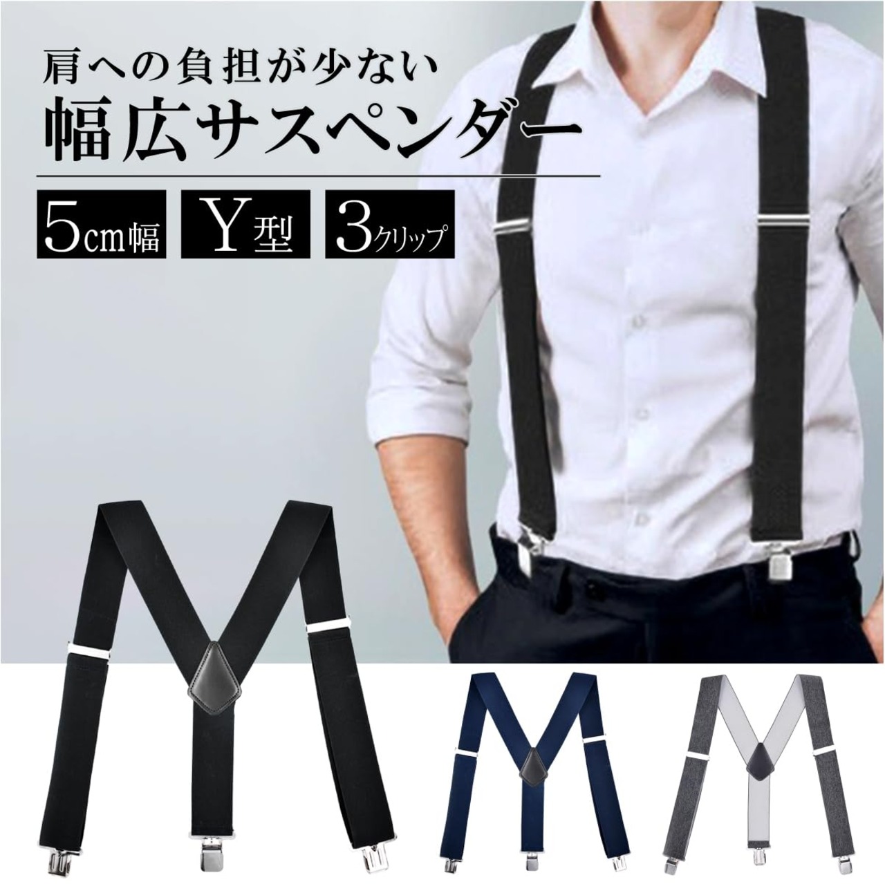 5cmの幅広で安定感あるY型サスペンダーです。 肩への負担が少なく、肩こりしにくい、肩へ食い込みにくい快適設計! 伸縮性があり体型を選ばない、調節可能なサスペンダーです。 3つの頑丈なクリップで留めるので、しっかりでホールドできます。 シンプルなデザインでカジュアル、フォーマル問わずご使用いただけます。 【Y型は、シンプルさや軽快さを重視する方におすすめ!】 ・3箇所で固定するため、装着が簡単で使いやすい。 ・背中の見た目がすっきりしており、幅広いスタイルに適しています。 ・背中の固定箇所が少ないため、動きやすい。