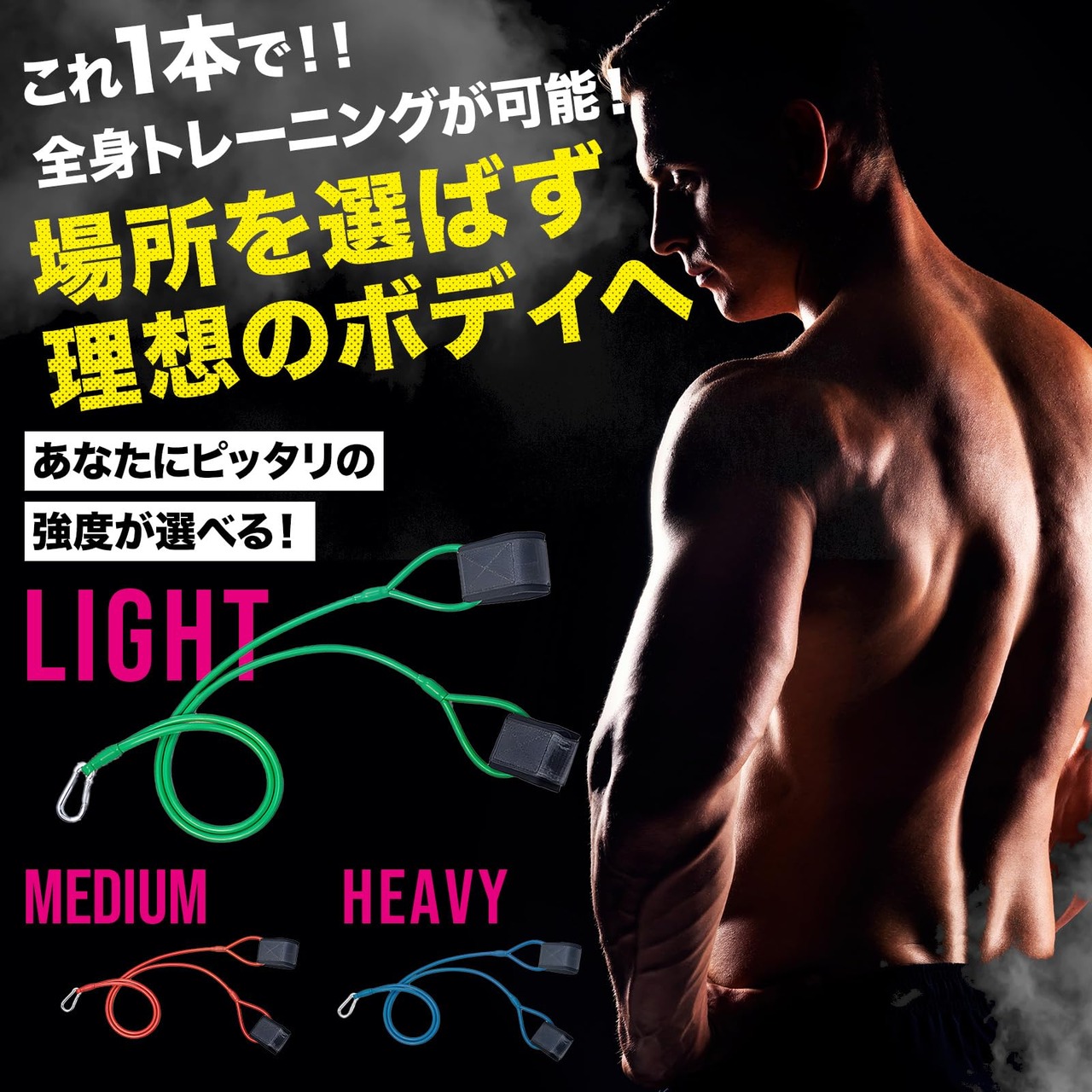 ■商品特徴<br> ​自宅で手軽に本格的なトレーニングを始めたい方に最適なトレーニングチューブです。<br> ​筋トレやストレッチ、ダイエット器具として多目的に活用でき、全身の筋力強化や柔軟性向上をサポートします。​<br> 野球の筋力トーレニングで採用されており、これ一本で様々なトレーニングの組み合わせが可能です。 <br> 高品質なラテックス:​耐久性と伸縮性に優れ、長期間の使用でも劣化しにくい設計です。​<br> 多用途なトレーニング対応:​筋トレ、ストレッチ、リハビリ、ダイエットなど、さまざまな目的で使用できます。​​<br> 省スペースでの保管と携帯性:​軽量でコンパクトなデザインのため、自宅やオフィス、旅行先でも手軽にトレーニングが行えます。<br>​ このトレーニングチューブセットを活用して、日々のフィットネス習慣を充実させ、理想のボディを目指しましょう。<br> <br> ■カラー別負荷<br> グリーン Light 4x9mm<br> レッド Medium 6x11mm<br> ブルー Heavy 6x13mm<br> <br> ■使用方法<br> 以下のトレーニングで使用する際に最大限の効果を発揮します。<br> チューブプッシュアップ:胸部(大胸筋)を鍛えるのに効果的です。<br> チューブローイング:背中(広背筋)を鍛えるのに効果的です。<br> チューブスクワット:下半身(大腿四頭筋、ハムストリングス)を鍛えるのに効果的です。<br> チューブカール:腕(上腕二頭筋)を鍛えるのに効果的です。<br> チューブクランチ:腹部(腹直筋)を鍛えるのに効果的です。<br> <br> 上記のトレーニングを組み合わせで行う事で、全身の筋力強化や柔軟性の向上が期待できます。<br>​ 各エクササイズは15回を1セットとし、2〜3セット行うことをおすすめします。<br> ​トレーニング中は正しいフォームを維持し、無理のない範囲で行いましょう。<br> <br> ■注意事項<br> ・使用前に必ずチューブの劣化・破損がないか確認してください。<br> ・鋭利な物やザラついた場所での使用は避けてください。<br> ・急激な引っ張りや過度な負荷をかけないでください。<br> ・濡れた状態や湿度の高い場所での保管・使用は避けてください。<br> ・使用中は周囲に人や物がない安全なスペースを確保してください。<br> ・乳幼児やペットの手の届かない場所に保管してください。<br> ・高温になる場所や直射日光の当たる場所には保管しないでください。<br> ・本来の用途(運動・トレーニング)以外には使用しないでください。<br>
