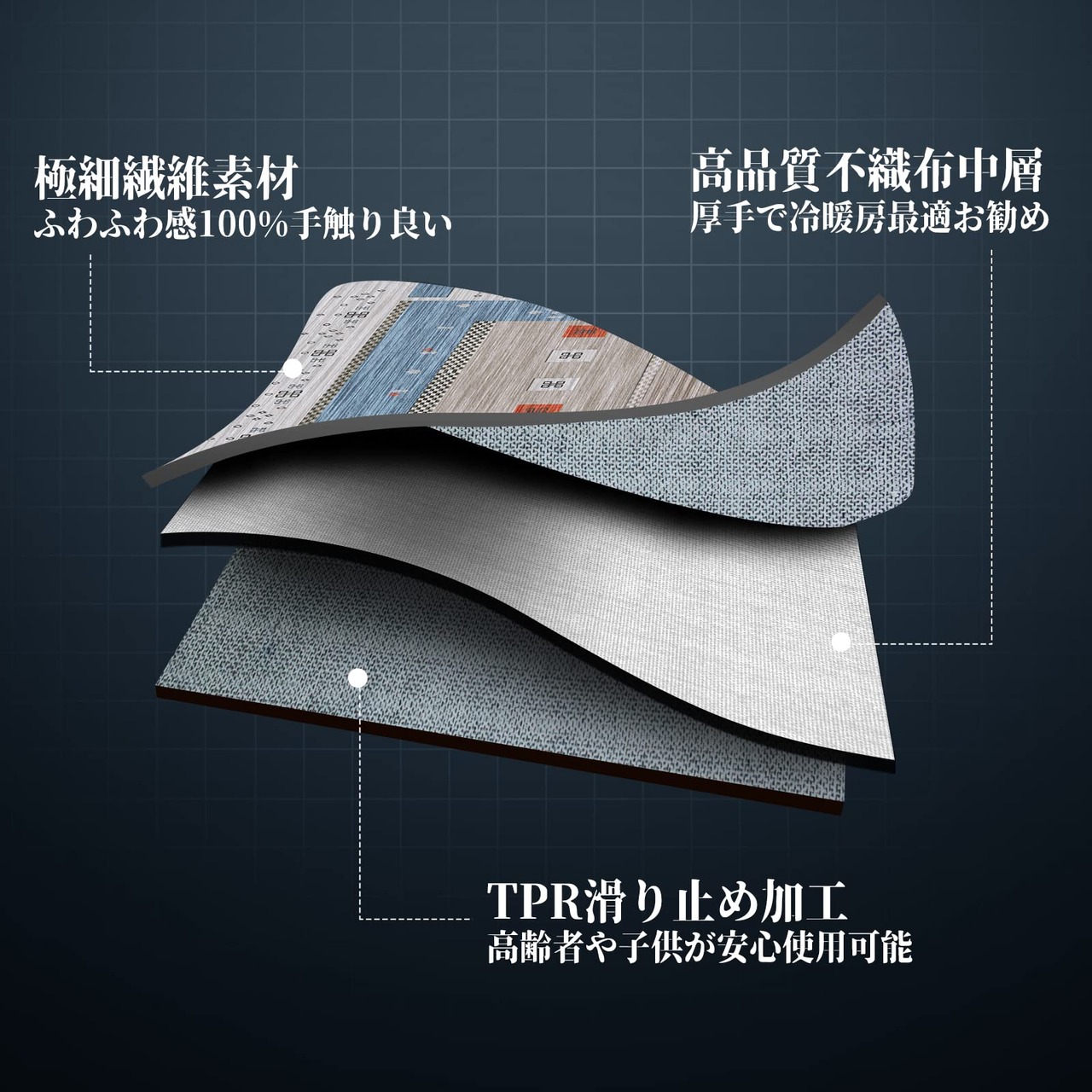 【安心滑り止め加工】トイレマットの裏面には、不織布とTPR(熱可塑性ゴム)を組み合わせた素材が使われており、優れた滑り止め効果を発揮します。この設計により、滑りやすいトイレ環境でもマットがしっかりと固定され、安定性が保たれます。さらに、不織布の透湿性のおかげで、湿気や異臭の発生を効果的に防ぐことができます。