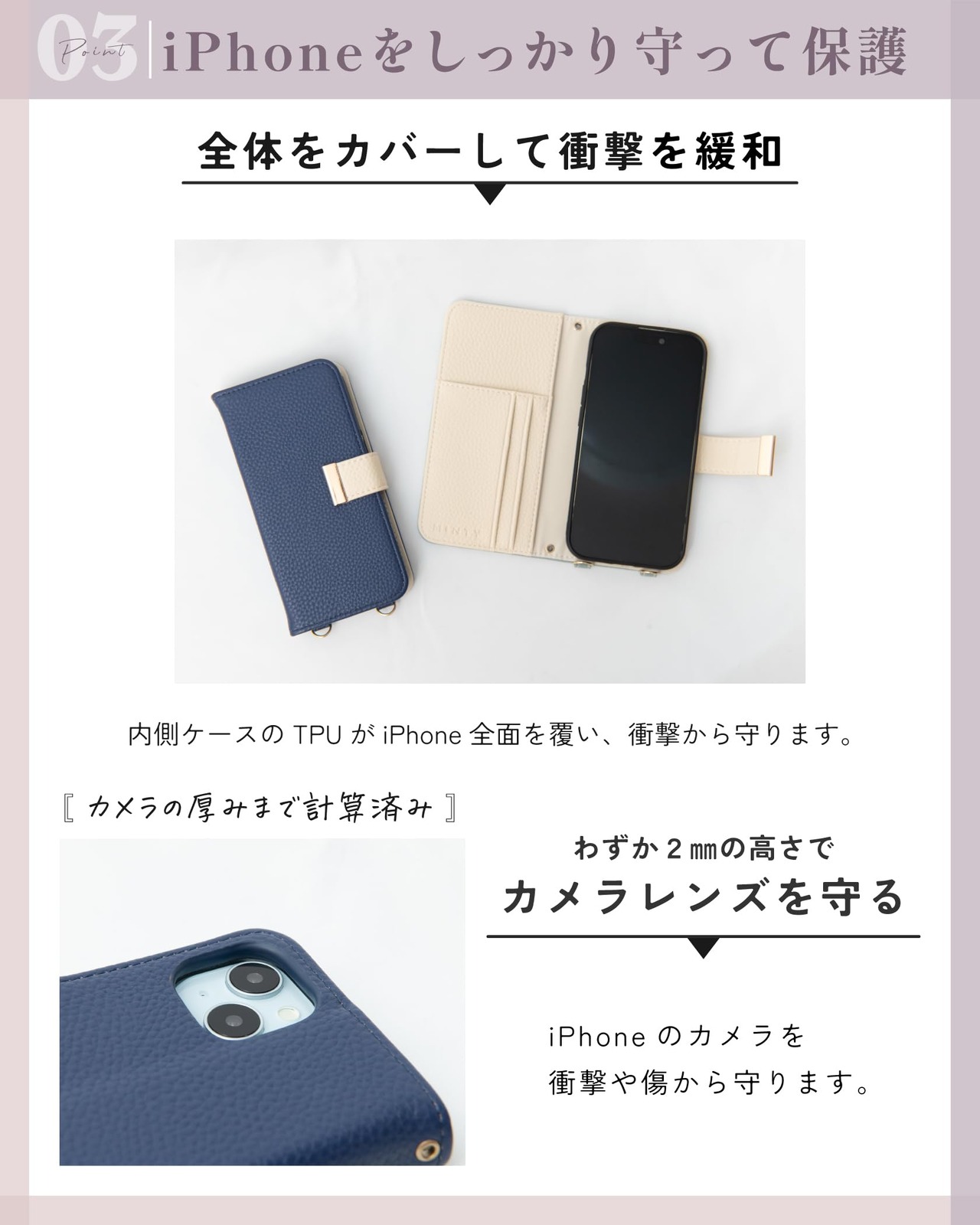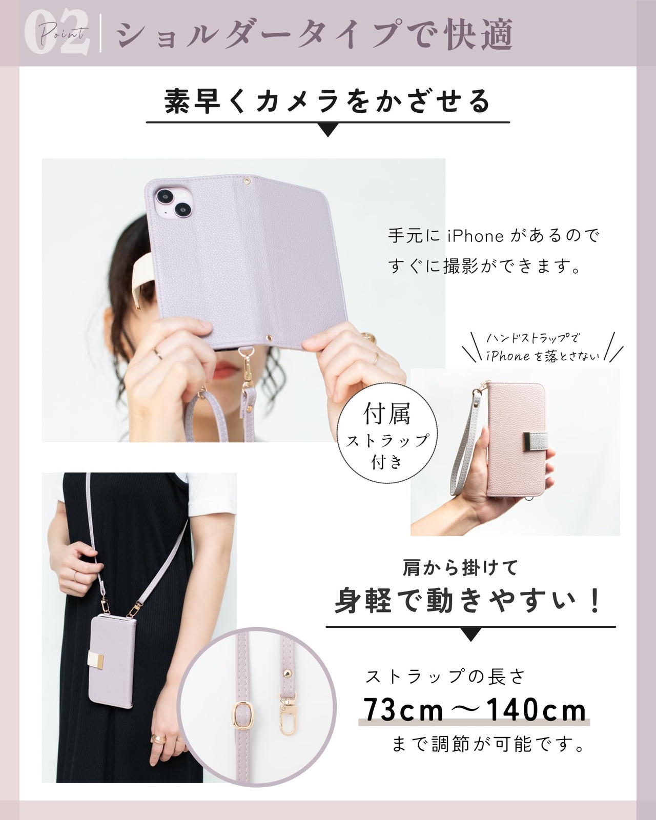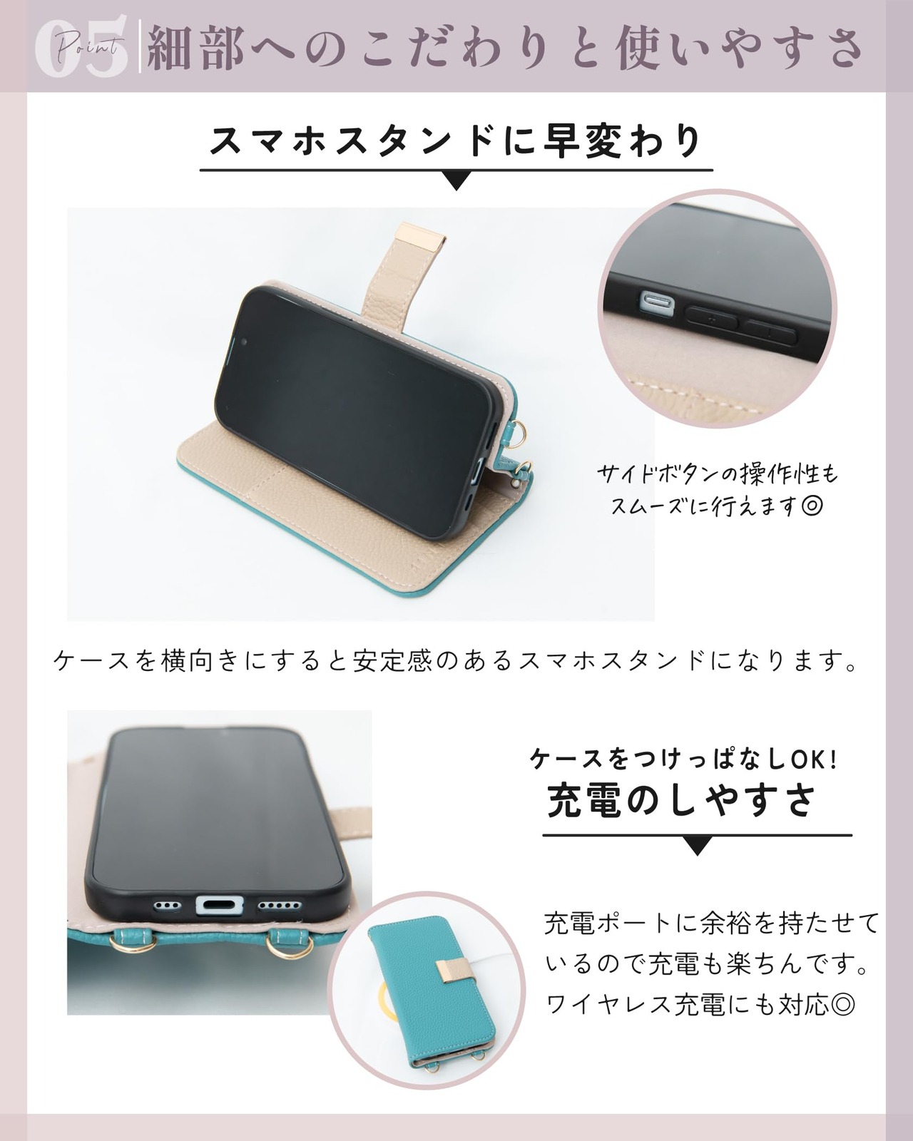 ✅【その他仕様】ショルダーストラップ取り外し・長さ調整可/ハンドストラップ取り外し可/カードケース1・フリー収納1/スタンド機能/装着時カメラ撮影可(※超広角カメラで撮影した際にケースの一部が写り込む可能性がございます)/タッチ決済可/アクションボタン保護/ストラップホール2個/Dカン2個【材質】(外側) PU / (内側) TPU