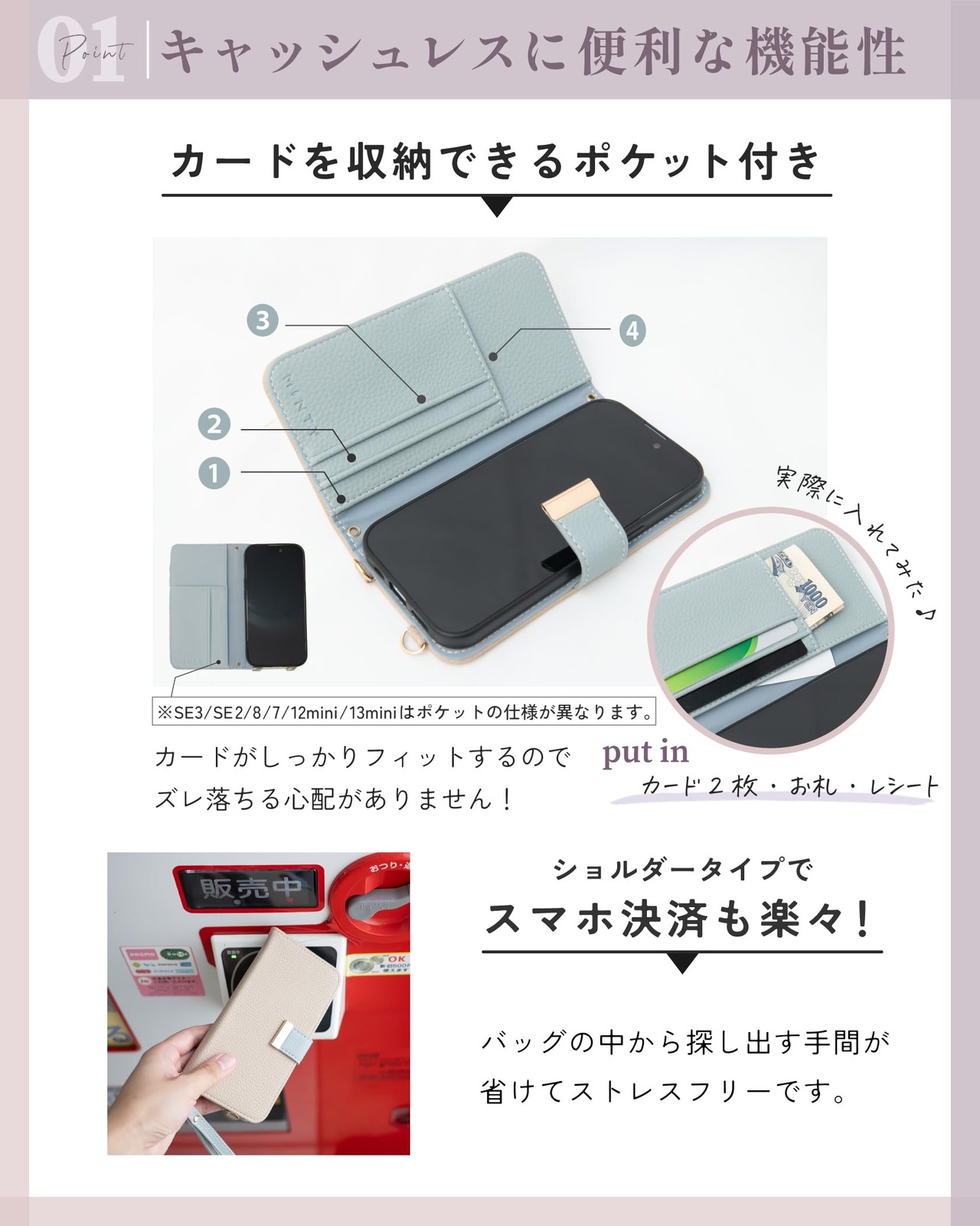 ✅【キャッシュレスに便利な機能性】カードを収納できるポケット付き。ショルダータイプでスマホ決済も楽々!