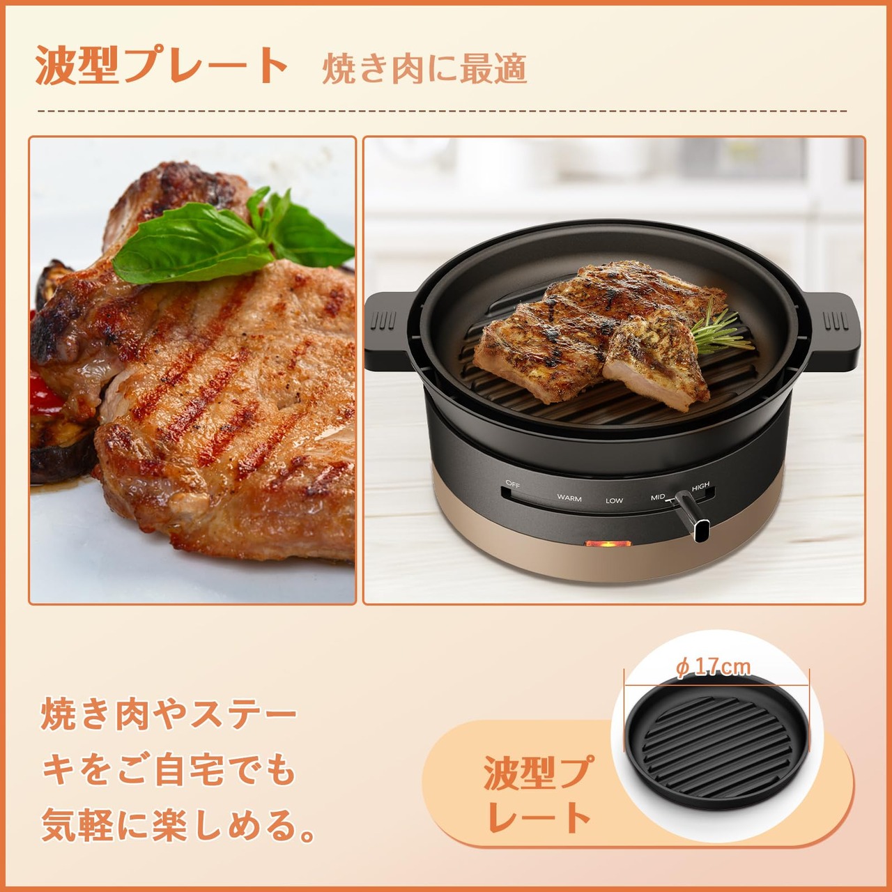 【一台多役】グリル鍋寸法:直径17cm×深さ8cm、お湯を沸かすのはもちろん、しゃぶしゃぶやラーメンまで楽しめる。煮る、焼く、炊くと様々な場面でも大活躍!1人鍋は一人暮らしの方に最適です。付属ホットプレート次第で、定番の鍋料理のほか、焼肉・パエリア・串カツなどにも対応できます。一人鍋は様々な場面でも大活躍!