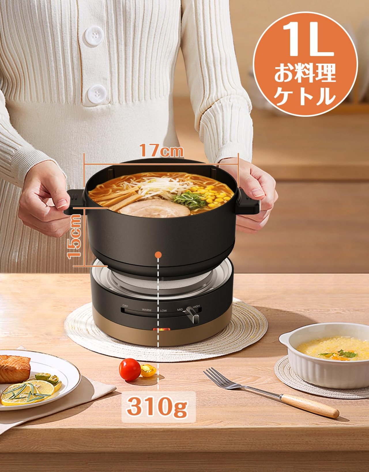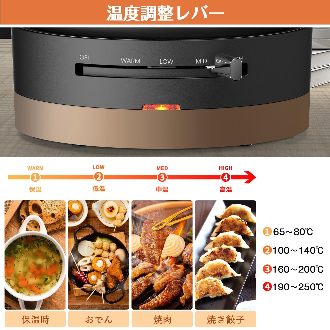 【温度調整機能】電気鍋は4段階の温度目盛「保温、低、中、高」、本体下部のレバーをスライドさせれば、65~250℃までスムーズに温度を調節可能です。メニューに合わせて温度を調整し、1人鍋は加熱ムラが出にくい、ラーメンとスープなどの料理がもっと美味しいです。(1L水沸騰までの目安時間:10~15分)