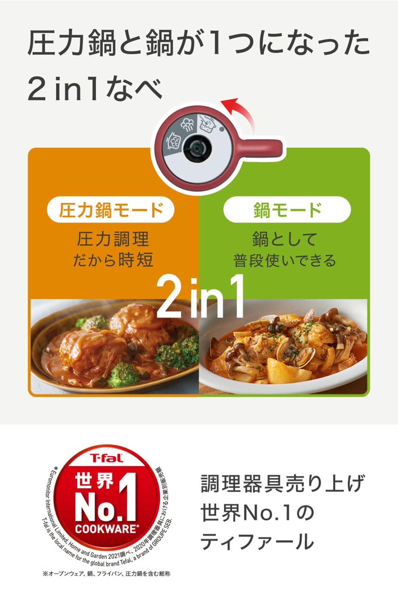 ティファール 圧力鍋 5.2L 3~5人用 IH ガス火対応 カンタン開閉 2in1なべ 「クリプソ ミニット デュオ ルージュ」 ふっ素樹脂コーティング P4705132