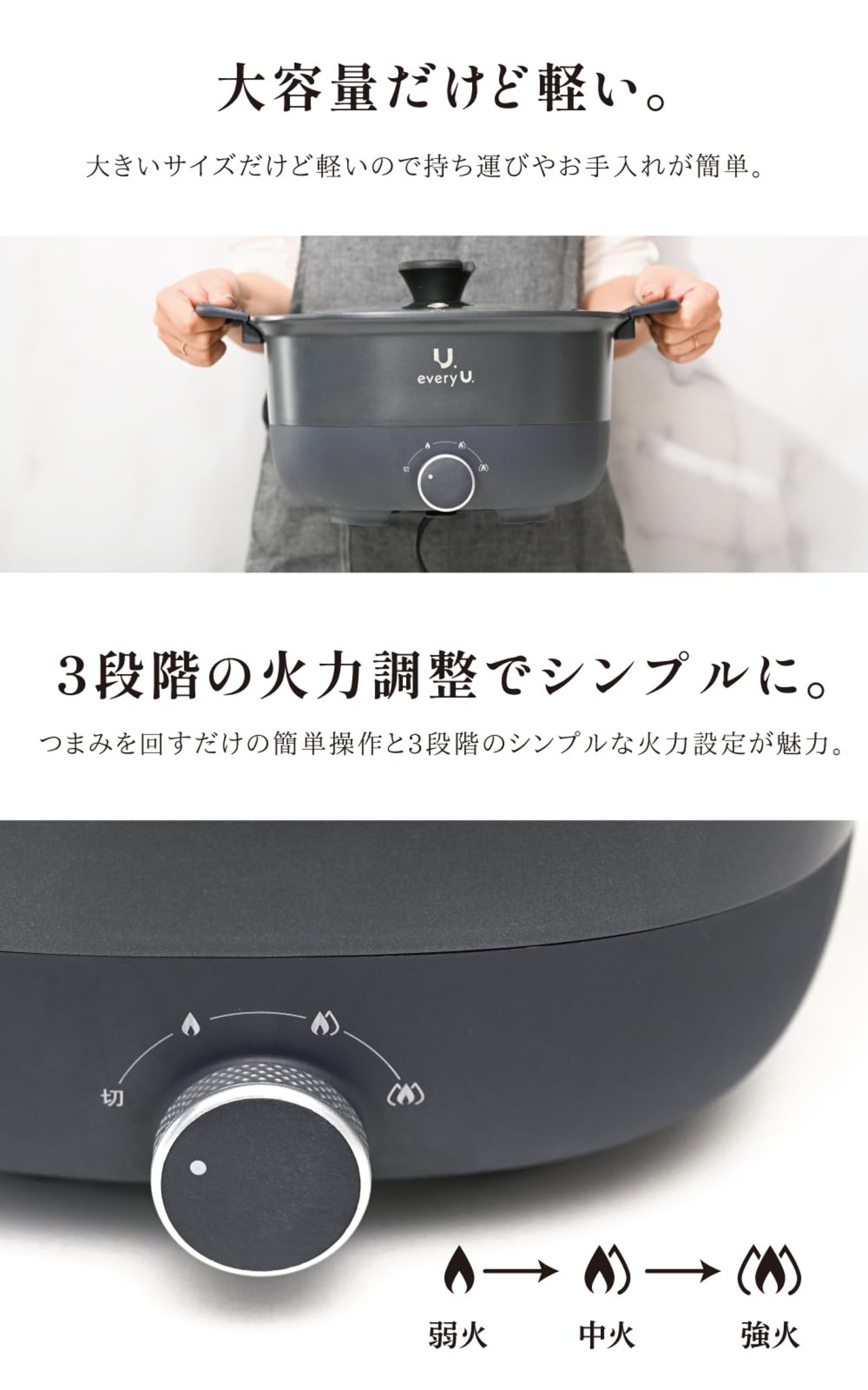 every U. 両手電気鍋 5L 温度調整3段階 波型プレート セラミックコーティング ガラス蓋付き 1人用 大人数用 グリル鍋 鍋 ラーメン 目玉焼き おでん うどん 炒めもの 多機能 車中泊 every U. 1台5役の多機能両手鍋 5.0Lの大容量 1. 煮る 2. 炒める 3. 焼く 4. 炊く 5.揚げる 大容量だけど軽い。大きいサイズだけど軽いので持ち運びやお手入れが簡単。 3段階の火力調整でシンプルに。つまみを回すだけの簡単操作と3段階のシンプルな火力設定が魅力。 スタイリッシュな デザインとこだわり。モノトーンカラーとスクエア型のシルエットでインテリアに馴染みやすいデザインを採用。 ガラス蓋には調理器具がおけて便利に。 付属のコンセントも底面に巻いて収納が可能です。 一人暮らしでも大人数でも。おでんや鍋ものなど大人数向けの調理はもちろん、1台で様々な料理ができるので一人暮らしさんにもおすすめです。 一台でできる5通りの調理 ・お鍋として煮込む・茹でるはもちろん、 ご飯を炊いたり、 焼き物・炒め物・揚げ物にもご活用いただけます。 安心・安全・長持ち 美味しいが揃ったセラミック加工 ・グリルにも最適な鍋底 ・耐久性に優れて長持ちする点はもちろん、 PTFE/PFOAフリーで安心して長くお使いいただけるセラミック加工を採用しました。 ・熱伝導の良さと遠赤外線効果もあるので焼き物にも適しています。 ・食材がくっつきにくく、汚れ落ちもいいのでお手入れも簡単です。パンケーキも 綺麗に焼けます。※底面の排気穴に水が入らないようにご注意ください。 ■商品の仕様 本体サイズ(約):幅37x奥行28x高さ20cm ・材質:本体:PF、アルミニウム、蒸し器:ステンレス、蓋:ガラス ・鍋表面:表面加工:セラミックコーティング(プレート) 消費電力:1200W ・安全装置:温度ヒューズ ・電源:AC100V (50Hz/60Hz) ・商品重量:2.3kg ・コード長さ:1.2M ※底面の排気穴に水が入らないようにご注意ください。