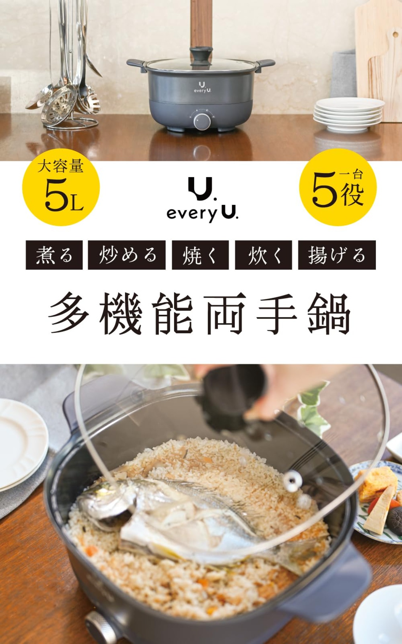 every U. 1台5役の多機能両手鍋 5.0Lの大容量 1. 煮る 2. 炒める 3. 焼く 4. 炊く 5.揚げる
