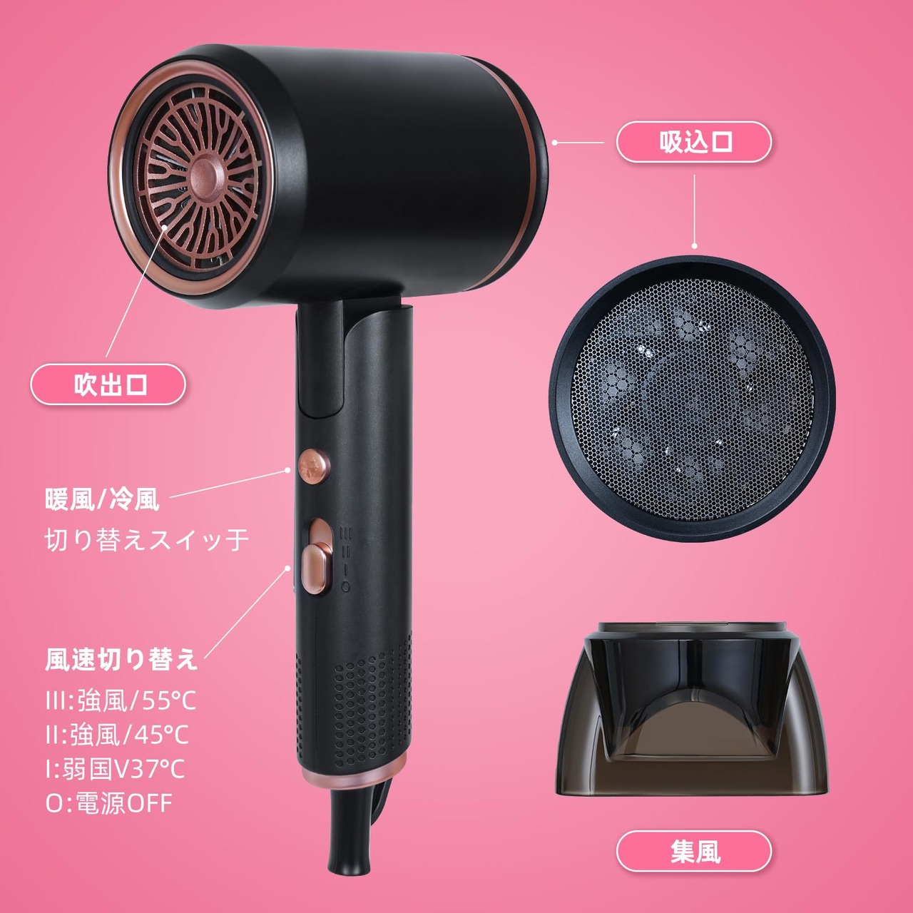 【3段階風速調整&過熱防止機能を搭載】 このヘアドライヤーには3つの温度設定があります:室温・恒温と高温。55℃のインテリジェント恒温保護機能を搭載しており、髪の高温ダメージから守ります。NTCが毎秒1500回温度を検出し、風温が100度を超えると加熱線はすぐに電源が切れるため。髪が乾燥して乱れやすくなるのを防ぎます。自分の好みに合わせて温度や風量を調節できるので、髪にやさしいケアが可能です。さらに、このヘアドライヤーはボタンひとつで冷風と温風を切り替えることができます。冷風や温風が必要な場合は、ボタンを押すだけで温度モードを切り替えることができます。