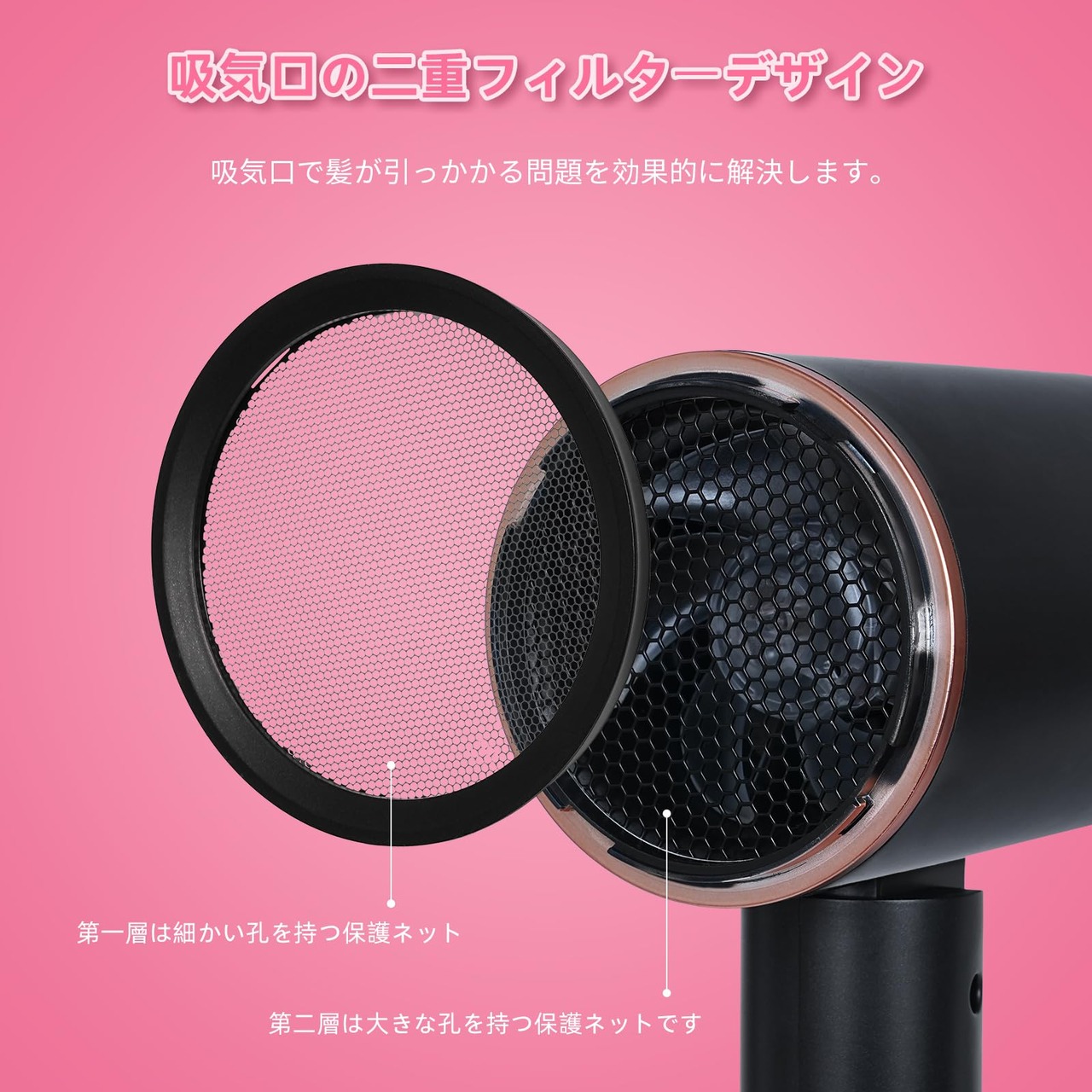【高濃度マイナスイオン機能を搭載】ヘアドライヤーは、高濃度負イオン高速噴射技術により、豊富なマイナスイオンを髪に届け、しっとりとした潤いを浸透させます。このマイナスイオンドライヤーは、空気中の水分を髪に吸着しやすいマイナスイオンに変換し、風と共に送り出すことで、キューティクルの損傷を防ぎ、髪の潤いとツヤをキープします。ダメージを受けた部分に保護膜を形成し、髪を持続的に黒く艶やかに保ちます。また、髪に帯びた正電荷をすみやかに中和し、サラサラ&ツヤツヤのまとまりのある髪に仕上げます。