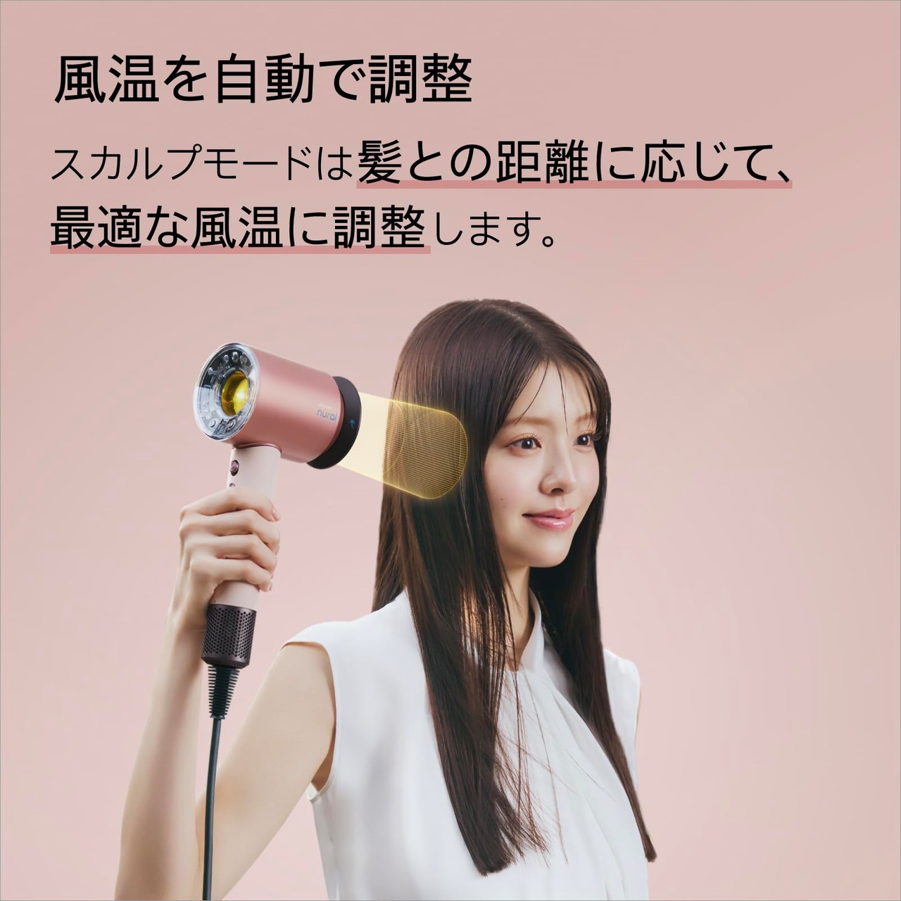 【スカルプモードを新搭載】スカルプモードをオンにすると、髪との距離を測定して風温を自動で調整します。連動して、温度センサーランプが赤、オレンジ、黄で風温の変化をお知らせ。